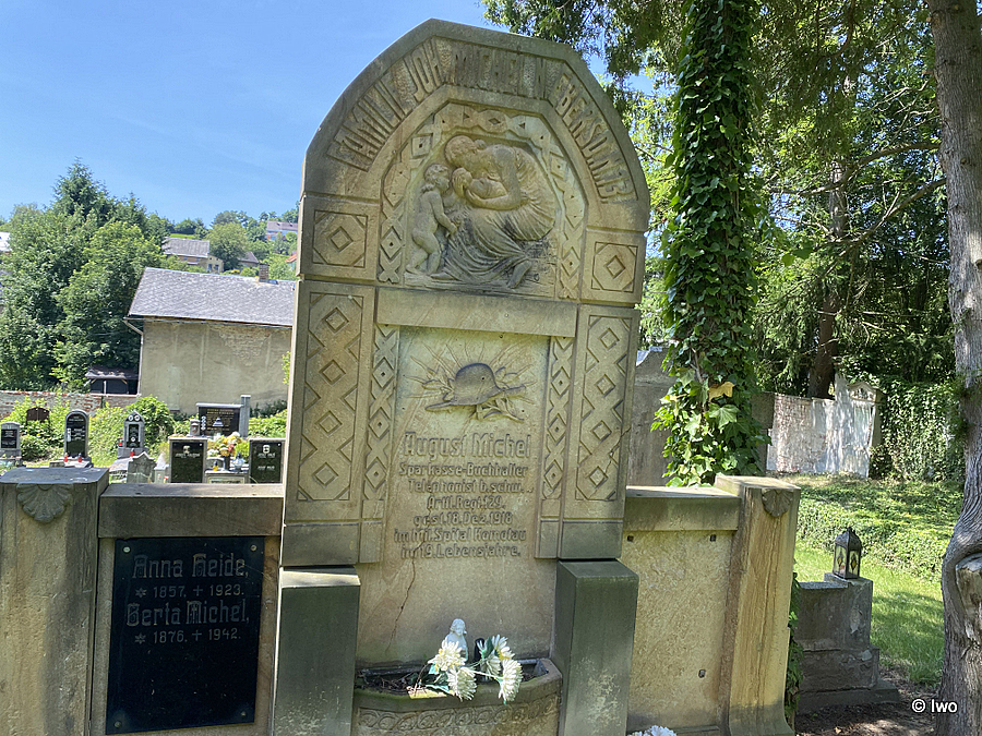 Vpravo od vstupu na hřbitov v Benešově nad Ploučnicí směrem k jihozápadnímu rohu areálu stojí rodinný hrob Johanna Michela, jehož součástí je kenotaf Augusta Michela.