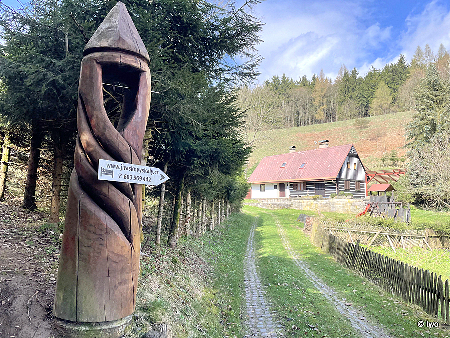 Na trase zelené a žluté turistické značky Via Czechia obcí Skály (dnes část Teplic nad Metují) stojí na rozcestí k chatě Jiráskovy Skály dřevěná zvonička.