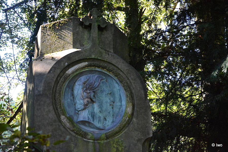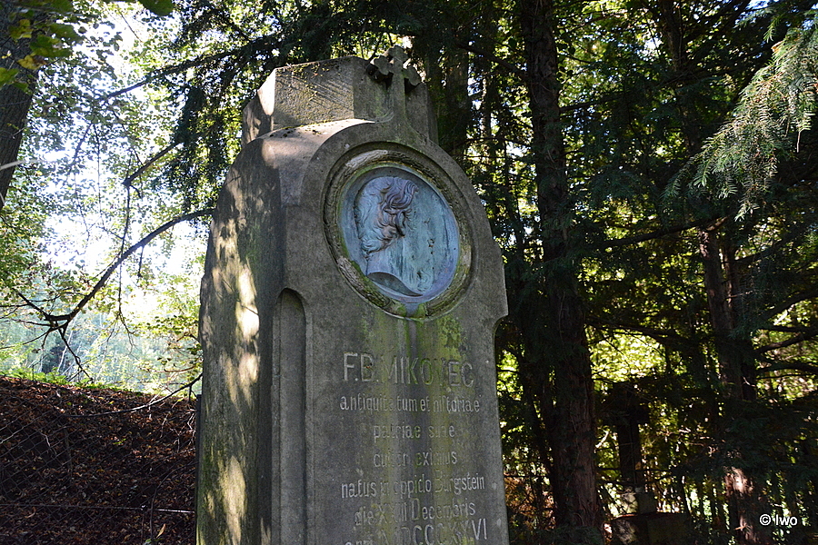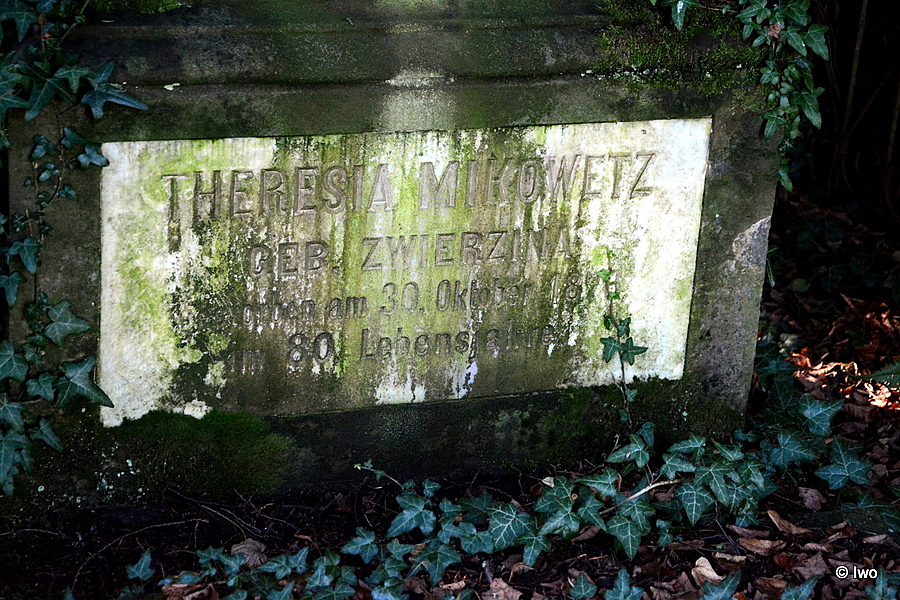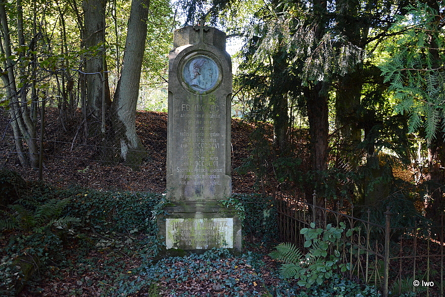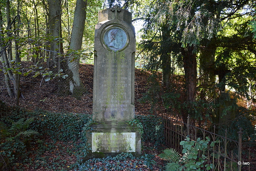 Zvláštní, že český buditel má nápis na náhrobku v latině (přepis viz výše tak trochu bez záruky) a zmíněná Terezie má nejen nápis v němčině, ale poněmčené celé jméno: „THERESIA MIKOWETZ / GEB. ZWIERZINA / orben am 30. Oktober 1876 / 80 Lebensjahre“. Podle data snad matka? A v popisu náhrobku je mi záhadou údaj o vsazení reliéfu „pod“ – jak je na obrázcích vidět, je v horní části, nad nápisovou deskou.