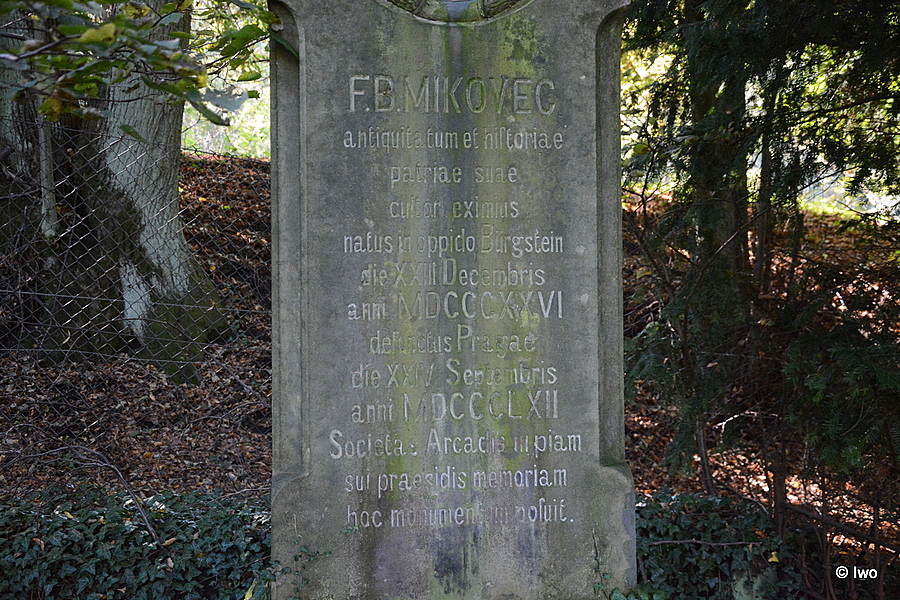 Náhrobek na horním konci hřbitova. V čele hrobu pískovcový hřbitovní náhrobek čes. spisovatele, pod ním vsazen kruhový relief portrétního profilu, rámovaný věncem. Na desce nápis: „F.B.MIKOVEC / antiqvitatum et historiae / ratrise snal / cultor eximius / vatris in oppido Bürgstein / die XXIII Decembris / anni MDCCCXXVI / defunctys Pragae / die XXIV Septembris / anni MDCCCLXII / Soceitaa Arcadia in pieru / sui quaesidis memoriam / hoc monumentum posuit“. Na soklu deska Terezie Mikovcové. Hrob přikryt pískovcovou deskou s vyrytým písmenem M.