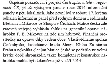 Ve zpravodaji MATICE ČESKÉ SEKCE SPOLEČNOSTI NÁRODNÍHO MUZEA za rok 2014: