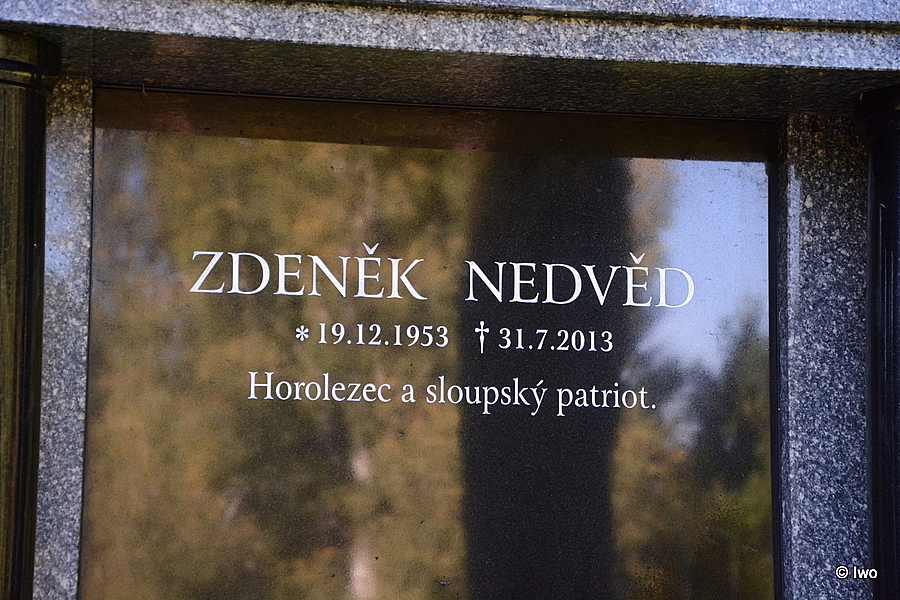 Na náhrobku stručný nápis: ZDENĚK NEDVĚD / * 19.12.1953 † 31.7.2013 / Horolezec a sloupský patriot. / Kde je vůle, tam je síla.