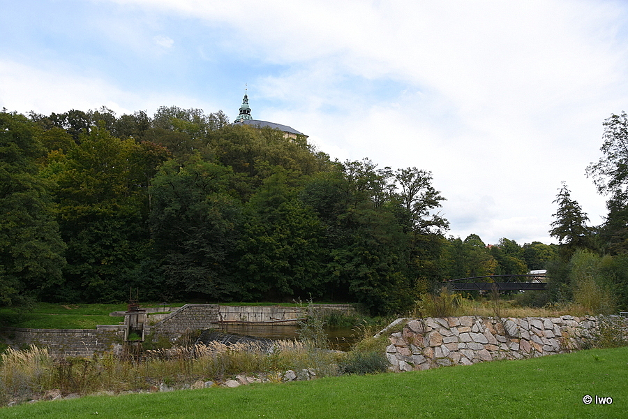 Proti hradu a zámku Frýdlant na opačném břehu říčky Smědá je vyznačena mezi jezem (od lávky) a křížovou cestou Lesní naučná stezka.