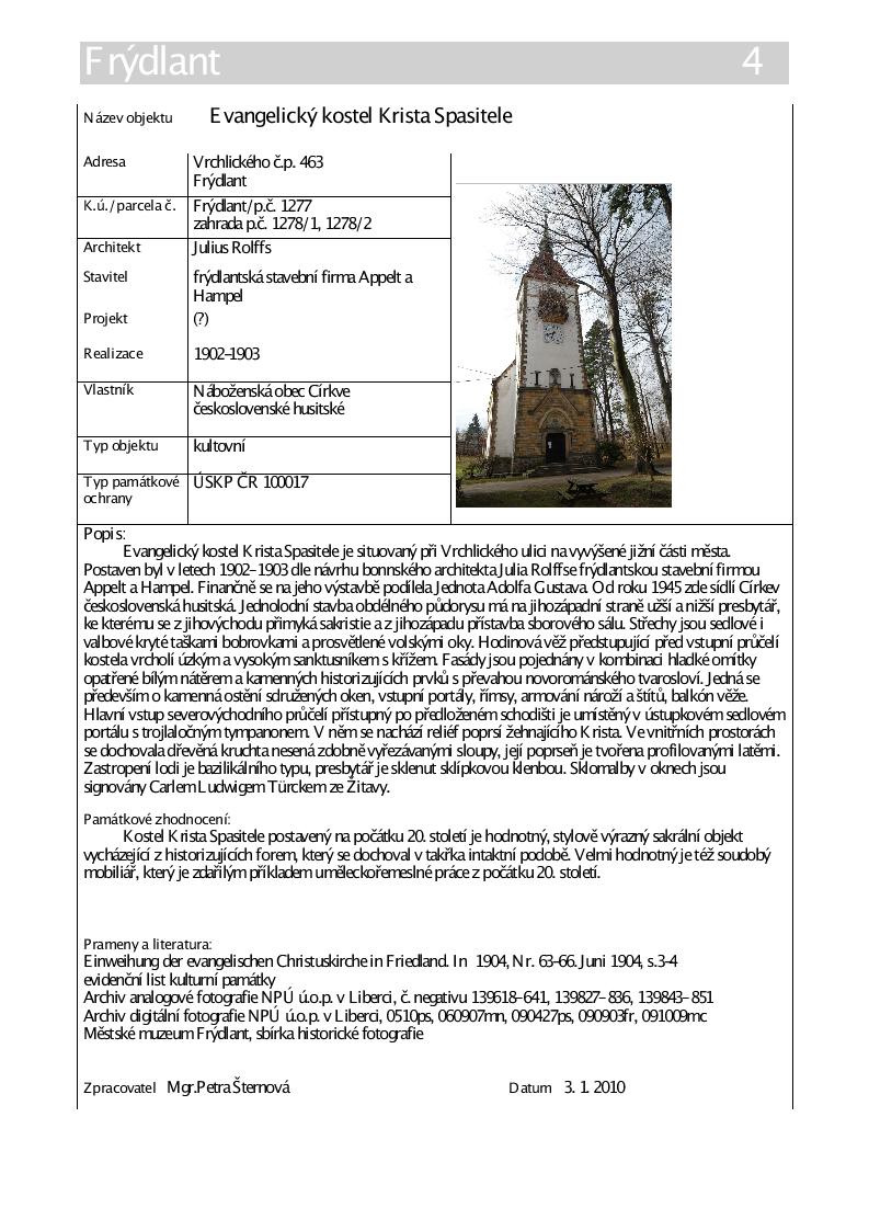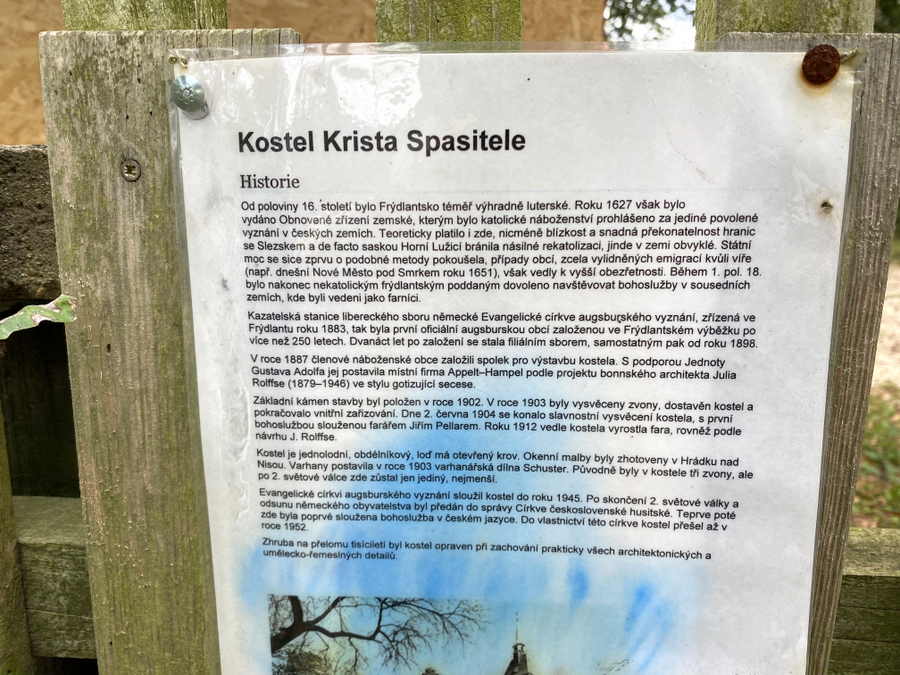 Evangelický kostel Krista Spasitele je situovaný při Vrchlického ulici na vyvýšené jižní části města. Architektonicky a esteticky velmi zajímavý kostel byl postaven v letech 1902–1903 dle návrhu bonnského architekta Julia Rolffse (1879–1946) frýdlantskou stavební firmou Appelt a Hampel. Finančně se na jeho výstavbě podílela Jednota Adolfa Gustava. Kostel původně sloužil církvi evangelické. Od roku 1945 (podle jiných pramenů až 1949) zde sídlí Církev československá husitská.