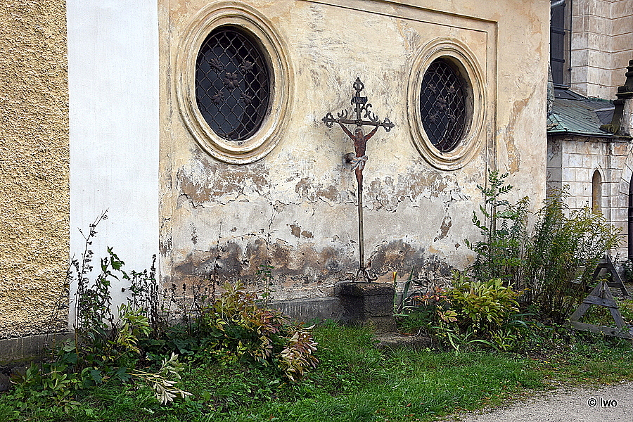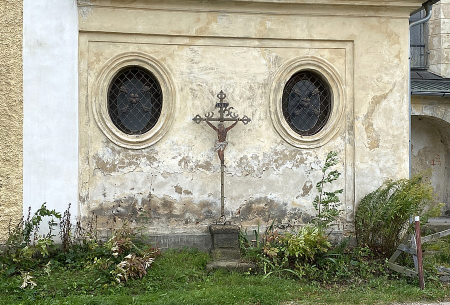 V trávě v prostoru mezi dvěma elipsovitými okny je umístěn nezvykle nízký silně omšelý sokl se základnou, vytvářející schodový stupeň (či snad klekátko). Sokl je částečně do kostelní zdi zapuštěn. Samotný kříž z plochého železa stojí na horní straně na široce rozkročené trojnožce a nese malovanou plechovou siluetu Krista. Horní část kříže včetně konců břeven je zdobena vykrajovanými ornamenty, jejichž části chybí. Mezi nimi je umístěna tabulky INRI.