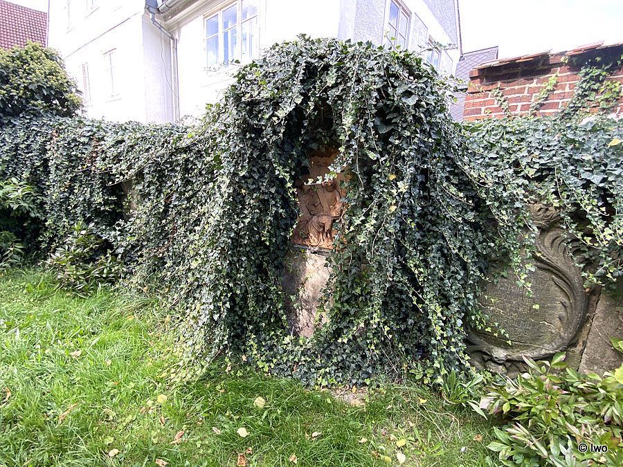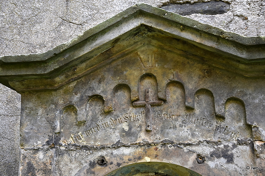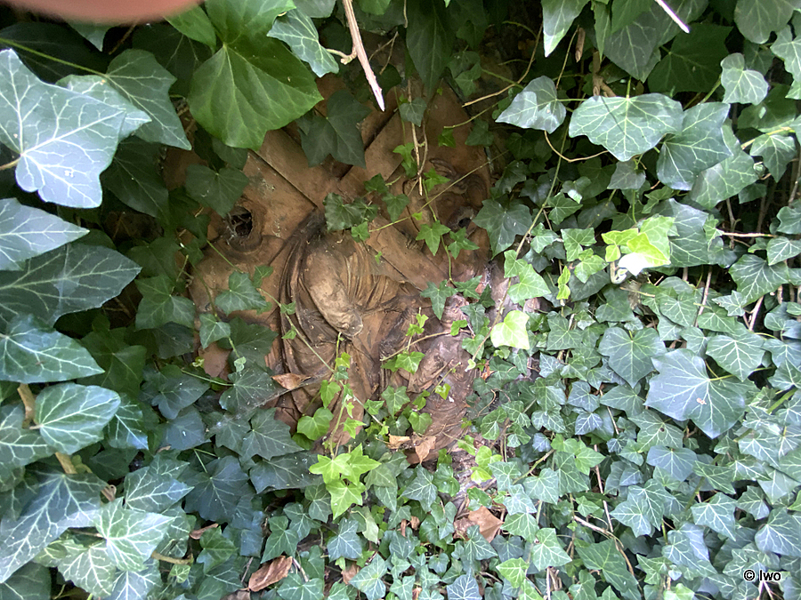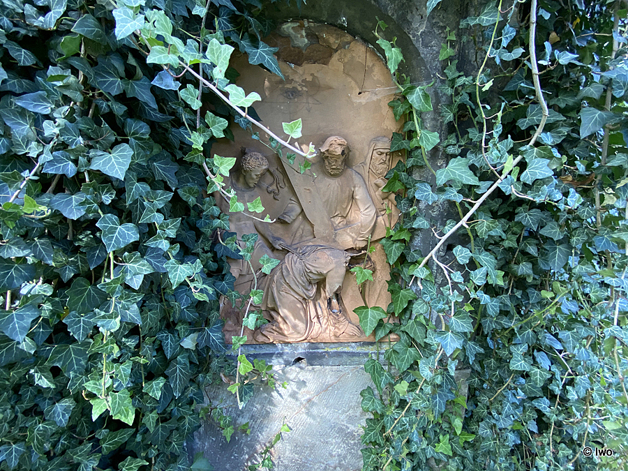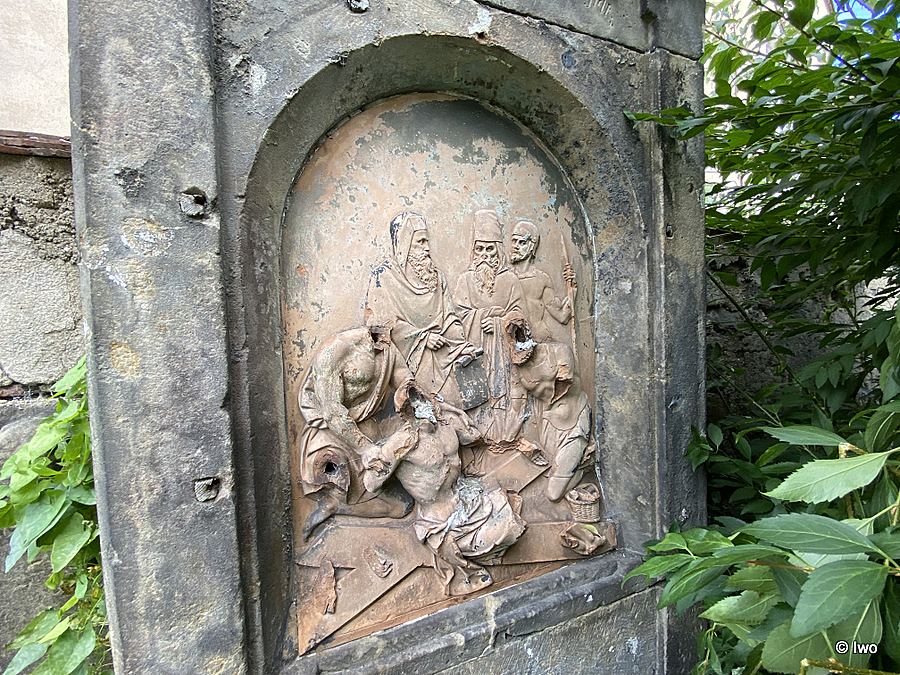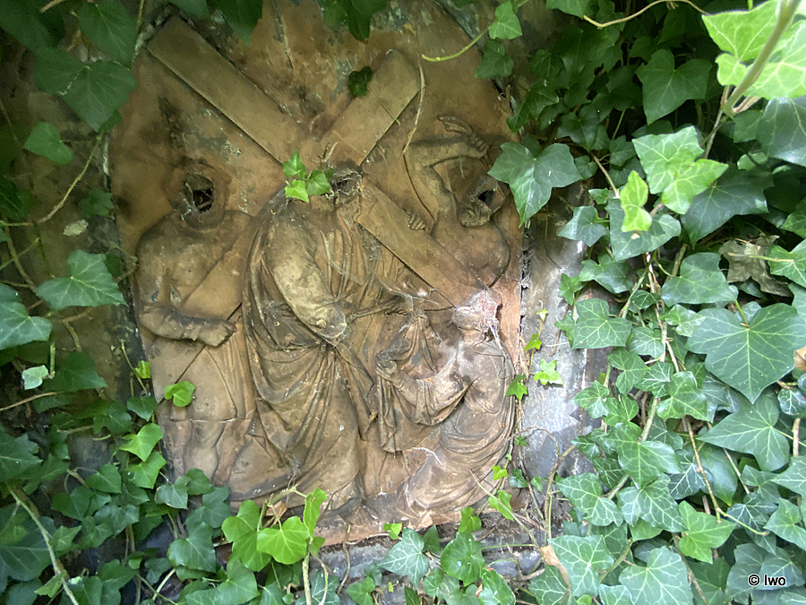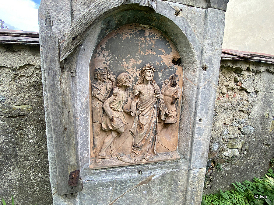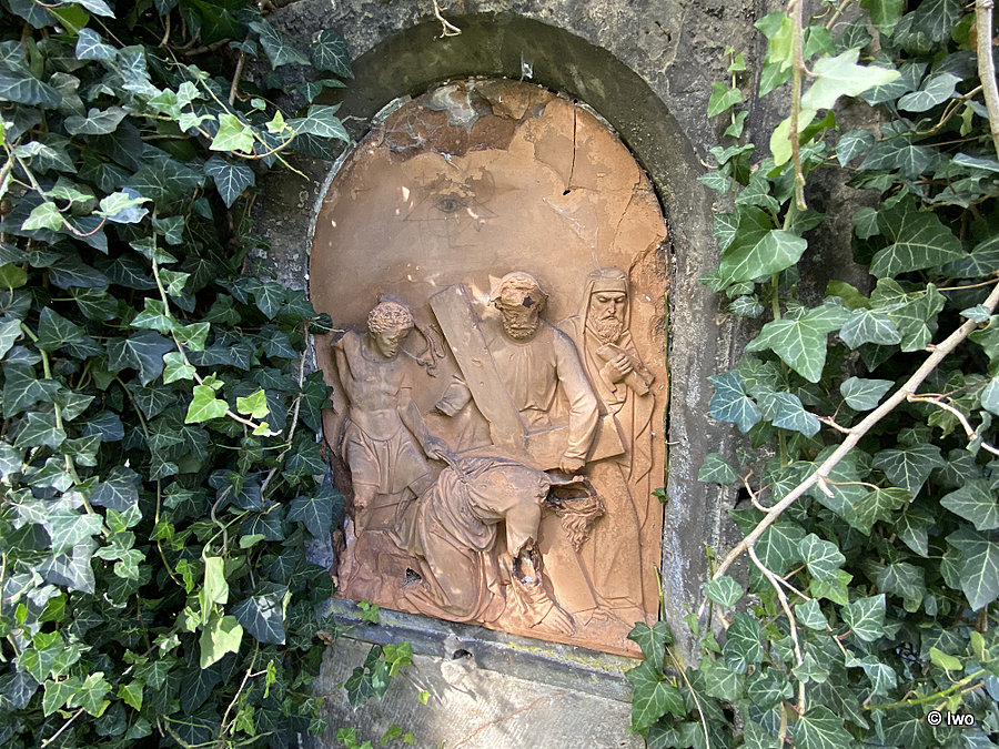 Skoro bych řekl, že označení „ve špatném stavu“ je v tomto případě příliš optimistické. Reliéfy rozbité, kaple olámané, drolící se. Některá zastavení jsem měl problém najít, než mi došlo, že musím být trochu jako princ v Šípkové Růžence. Prostě jsem některé větve ulámal a břečťan otrhal. Viz citace výše – možná tu nějaká revitalizace proběhla, ale kapliček se zjevně netýkala.