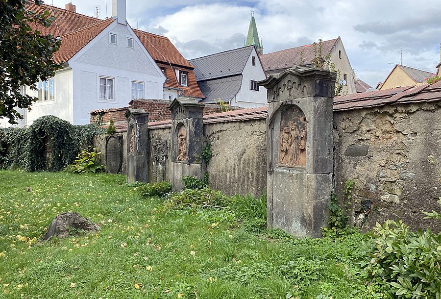 Zdi u areálu kostela se nacházejí okolo částečně upraveného současného parkového prostoru. Jsou omítané, vybudované ze smíšeného zdiva a kryjí je prejzy. Zeď kolem bývalého hřbitova zrušeného v roce 1710 je původně renesanční, později v roce 1679 barokně upravená. Z barokního období pochází zřejmě i zeď s bránou kolem děkanství. Po obvodu vnitřní strany ohradní zdi kolem bývalého hřbitova je umístěna křížová cesta. Do současnosti se dochovalo z původních čtrnácti zastaveních pouze devět výklenkových kamenných kapliček, a to od šestého zastavení až do posledního čtrnáctého. Každá z těchto kapliček je tvořena třemi kamennými bloky. Horní díl kapliček završuje profilovaná trojúhelně vzdutá korunní římsa. Pod ní je vytesán latinský kříž a obloučkový vlys. Ve střední části se nachází terakotový výjev scény z Ježíšova ukřižování, který niku vyplňuje. Nároží středního dílce rámují lizény přecházející na spodní díl. Na jednotlivých zastaveních se v torzech zachovala i vytesané pořadové římské číslice a také německy popsaný název výjevu. Stav souboru zastavení křížové cesty jako celku je ve 21. století špatný.