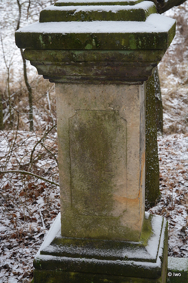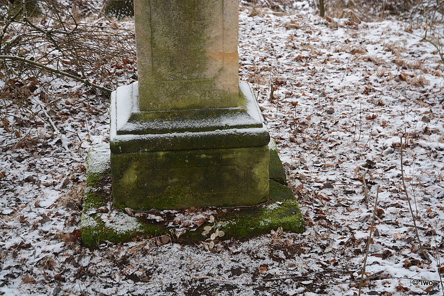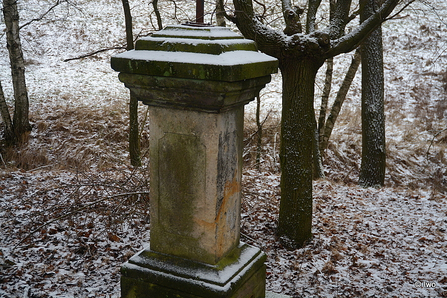 V mírně skloněném terénu mezi stromy kamenná základna, na níž stojí stupňovitý sokl. Spodní nízká široká část má v přední části takřka neznatelné ryté obdélné zrcadlo s projmutými rohy a v horná části nejprve oblou vystupující římsu a nad ní projmutou lištu, obepínající užší navazující tělo soklu. Útlý jednoduchý kvádr má na čelní straně také rytý obdélný obrys zrcadla s vykrojenými rohy, z nápisu nezbylo nic. Na dříku je umístěna velmi masivní stupňovitá hlavice. Odspodu několik různě širokých lišt projmutých i oblých k vrchní desce. Na té menší dvoustupňový soklík, v němž je umístěn kovový kříž, dle provedení nejspíš nepůvodní. Plochá pásovina, na koncích „téčka“, nahoře tabulka (rez dávno „odstranil“ obvyklá písmena INRI). Malá postava ukřižovaného Krista nese tolik nátěrů, že na ní nejsou patrné žádné detaily.