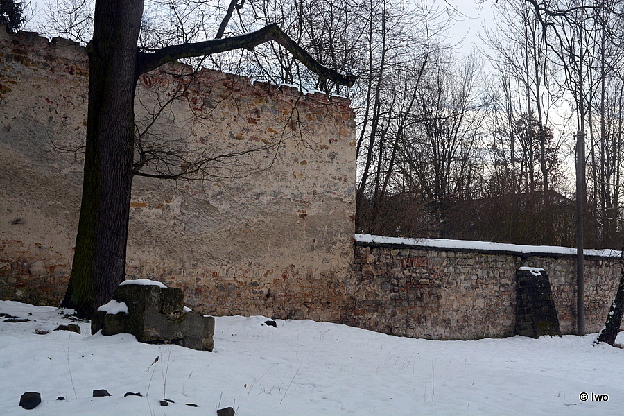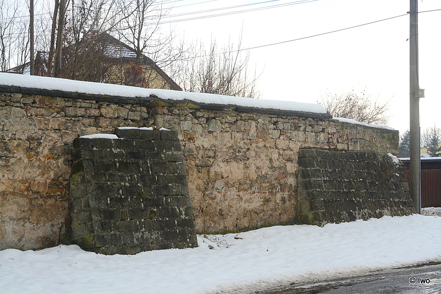 Zeď ohraničuje obdélný areál kláštera. Zeď je vysoká v rozmezí cca 2 – 4m, je zděná ze smíšeného zdiva s převažujícím podílem hrubě opracovaných pískovcových bloků. Nároží jsou armovaná. Korunu zdiva kryjí mohutné pískovcové desky se zkosenými horními plochami na obou stranách zdi. Pískovcové desky chybí zejména v severozápadní části a v jihozápadním nároží. V jižní části západní poloviny zdi jsou z vnější strany druhotně přisazeny opěráky z jemně opracovaných pískovcových kvádrů. Zeď byla původně omítnutá, část omítek je dosud dochovaná zejména na jižní straně zdi.