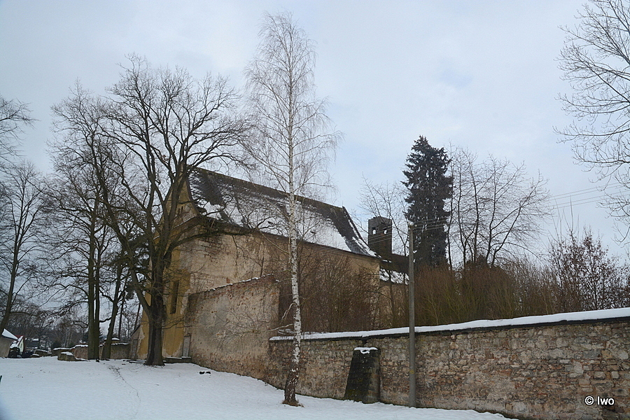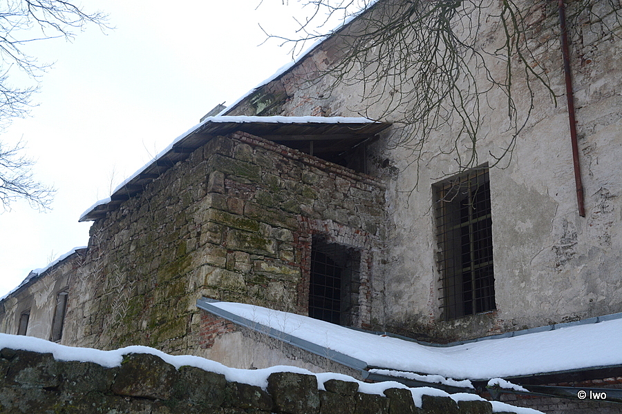 Klášter se nachází východně od zámku v severovýchodní části obce. Jde o čtyřkřídlou stavbu kolem rajského dvora s nárožním rizalitem v severovýchodním průčelí. Kolem jižního průčelí kostela probíhá úzká krytá chodba – vstup do kláštera – se stropem ve tvaru komolého jehlanu. Klášter je zděný z pískovcových bloků, patrový, střechy byly sedlové, naposledy kryté plechovými šablonami, dnes dochovány v torzu. Krov byl (v torzu je) hambalkový, s ležatou stolicí s vaznými trámy v každé vazbě. Spoje byly plátované. Okenní otvory jsou obdélné na výšku, se segmentovými odlehčovacími záklenky. Zřejmě v žádném z nich (stav objektu nedovoluje detailní průzkum) se nedochovalo okno. Rovněž nelze určit, jak byla architektonizována fasáda, omítky jsou dochovány rovněž v torzu. Jednoltivá průčelí měla (mají) následující počet okenních os – jižní průčelí jižního křídla sedm, východní průčelí východního křídla deset, severní průčelí severního křídla osm (?), severní průčelí jižního křídla pět (?), jižní průčelí severního křídla čtyři, východní průčelí západního křídla pět, západní průčelí východního křídla pět, přičemž v průčelí jsou ještě dva další druhotně zazděné otvory. V přízemí západního průčelí východního křídla a východního průčelí západního křídla se do prostoru rajského dvora otvírají arkády, v obou průčelích mají čtyři velká plným obloukem ukončená pole a v obou rozích po jednom menším – vstupním. Dochované dveřní otvory jsou obdélné, rámované pískovcovým ostěním s lištou po obvodu. Dispozice objektu byla v obou podlažích podélně dvoutraktová, s úzkou chodbou (v přízemí ambitem) podél rajského dvora. Přízemí bylo zřejmě z větší části (s výjimkou chodeb) sklenuto (valené klenby s výsečemi ?), patro bylo plochostropé, původně s trámovým stropem s překládaným záklopem. V jižním křídle se nacházel refektár, ve východním křídle byla kuchyně s vysunutým prostorem topeniště. Lavatorium bylo na východní straně jižního křídla. V patře byly cely, v severním křídle zřejmě i pro nemocné.