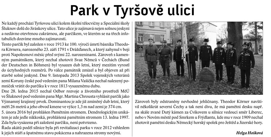 14. březen 2016 – V únoru přibyly na mapu památných stromů Šluknova další dva exempláře. V obou případech se jedná o duby letní a naleznete je v parčíku v Tyršově ulici a ve Fukově. Prvním nově vyhlášeným památným stromem je tzv. Körnerův dub, který byl vysazen roku 1913 u příležitosti odhalení pomníku básníku Theodoru Körnerovi. Dub dnes dominuje parčíku ve spodní části Tyršovy ulice a je základním kamenem celé parkové úpravy, která byla v nedávno době vyhlášena významným krajinným prvkem.