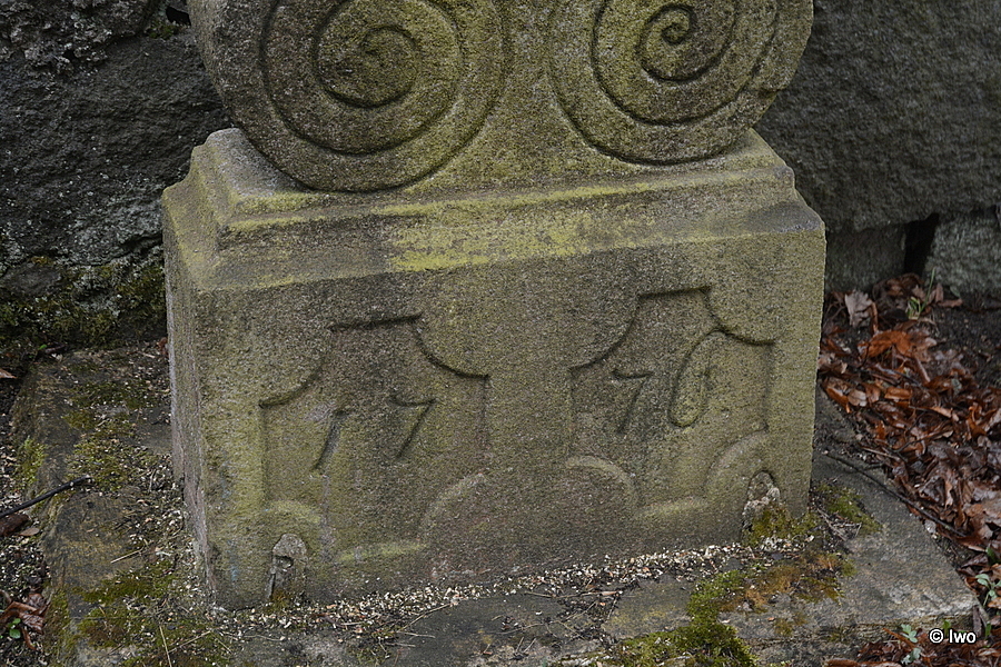 Masivní litinový kříž s konci ramen zdobenými vegetativními motivy a s postavou přibitého Krista je umístěn na profilovaném podstavci zdobeném volutovými motivy, který je umístěn na hranolovém nízkém soklu s datací do roku 1776.