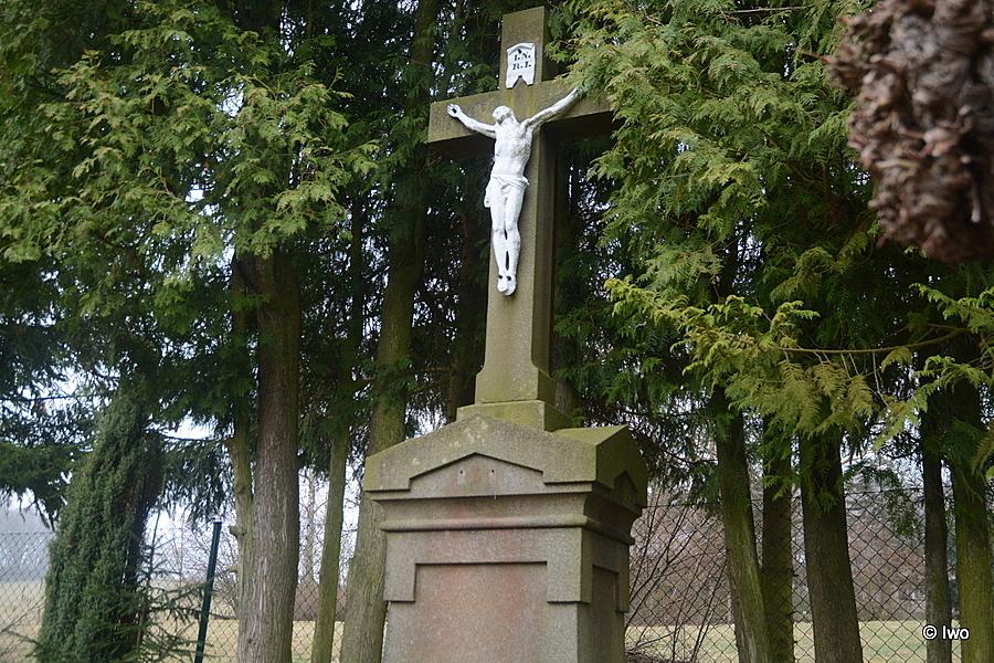 Na konci dlážděné cesty v ose hřbitova stojí kříž na mohutném soklu.