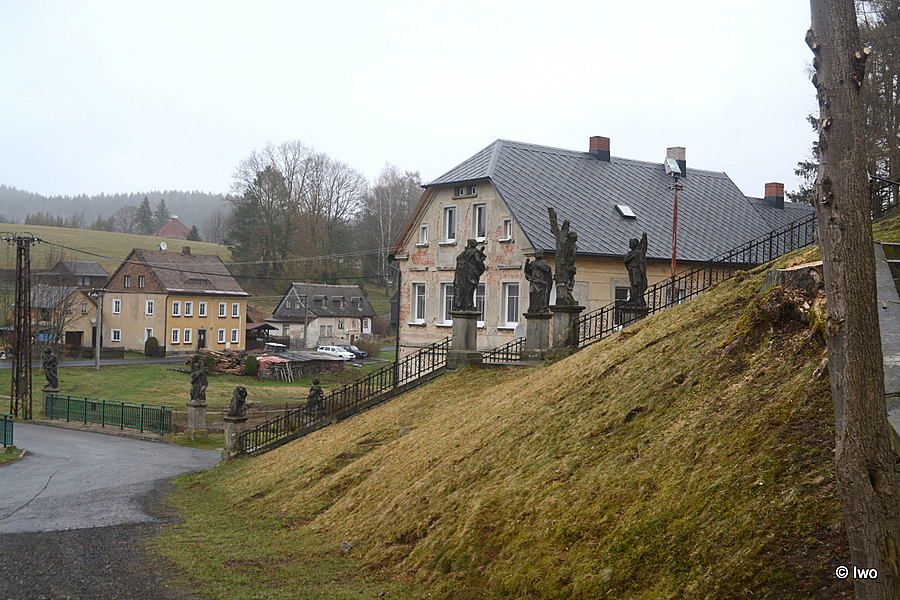 Součástí širšího areálu křížové cesty ve Vilémově s kostelem Nanebevzetí Panny Marie je přístupová cesta – most přes Vilémovský potok a schodiště ke kostelu – lemovaná řadou soch.