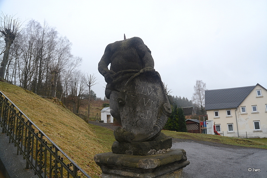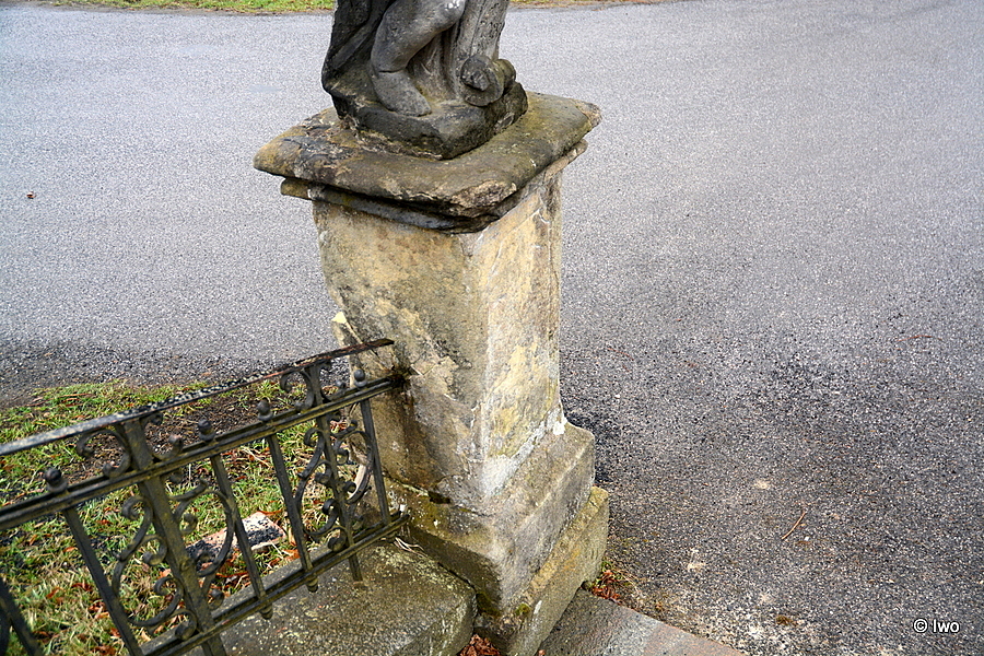 Barokní socha datovaná do roku 1738 zobrazující putti je provedena v pískovci a umístěna na hranolovém podstavci s římsovou hlavicí nacházející se ve spodní části schodiště vedoucího ke kostelu. Vlevo dole se nachází kartuš s nápisem.