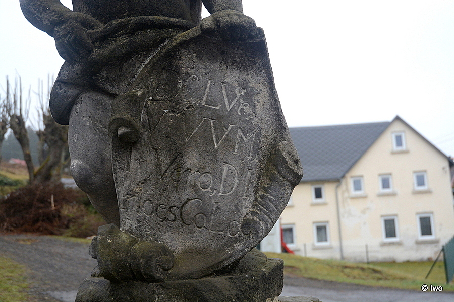 Putti vpravo s kartuší vpravo dole s nápisem: eX LVoVIVVM In Vero DIr Iqes CaLa. Chronogram s datováním 1738.