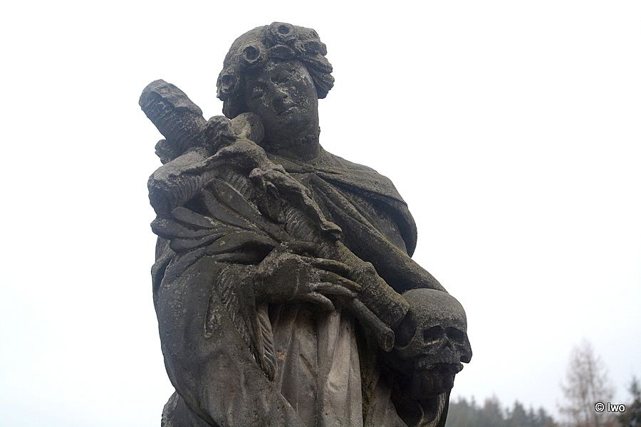 Barokní pískovcová plastika světice v životní velikosti oděnou ve zřasené draperii, držící v pravé ruce krucifix a v levé lebku pochází z let 1738 a je umístěna na hranolovém podstavci s římsovou hlavicí situovaném při schodišti vedoucímu ke kostelu.
