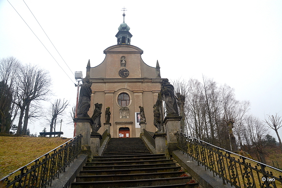 Po dokončení výstavby kostela v roce 1728 se majitel panství hrabě Leopold Salm rozhodl prostranství zvelebit vystavěním schodiště vedoucí ke kostelu. Autorem jeho sochařské výzdoby z roku 1738 byl Kristián Riedl, který zároveň vytvořil i sochu v nice průčelí kostela a sochy na mostu přes potok.