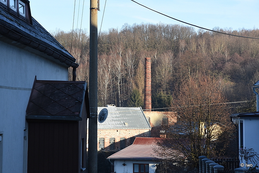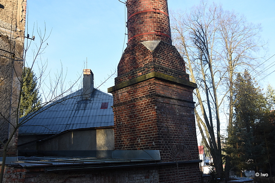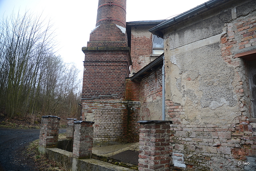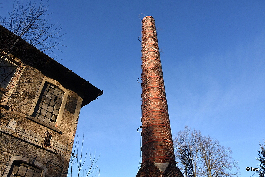 Původní cihlový komín z roku 1892 dnes ani zdaleka nenalezneme v původním stavu, jelikož v průběhu 20. století si prošel zajímavý peripetiemi. Originální výška komína činila 24 metrů a byl tehdy nezvykle postaven bez hlavice. Tu nechala až kolem roku 1915 dostavět dcera Franze Frenzela Mathilde Grohmann a komín tak získal novou výšku 28 metrů. Od ostatních komínů v regionu se liší nezvykle vysokým (takřka až do třetiny výše) hranolovým podstavcem. Nově postavena hlavice již vzhledem k době vzniku nebyla příliš okrasná, přesto dodala komínu elegantní tvar. V této podobě se komín dochoval až do roku 2009, kdy po letech zanedbávání údržby přistoupil nový majitel k poměrně radikálnímu kroku. Vychýlení ze svislé osy, kterým komín poslední roky trpěl, se začalo stupňovat do neúnosné míry, a tak nechal komín o sedm metrů ubourat. Současný výška komína tedy činí 21 metrů a stále ho můžeme nalézt v dobrém stavu. Pouze dmychadlo by si zasloužilo nový betonový věnec, jehož usazení bylo po ubourání zcela opomenuto a vrcholová partie komína je tak ohrožena velmi rychlou degradací.