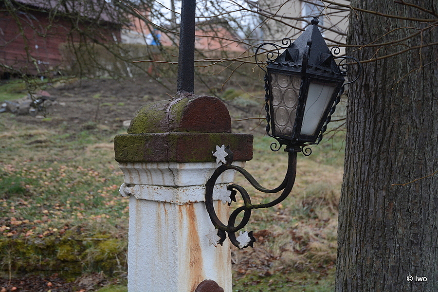 Mezi dvěma kmeny čtveřice kamenných čtverhranných sloupků s oblou horní stranou a záseky, v nichž umístěna dřevěná plaňková plotová pole (pravé chybí, kmen stromu překáží). V hlíně mezi jsou železnými kramlemi spojeny dva kamenné bloky, tvořící základnu pro vysoký štíhlý dřík, zužující se mírně směrem vzhůru. Spodní hranolová část s vystouplým obdélným polem na přední straně natřena hnědě, tělo dříku nabíleni. Na čelní straně dlouhé vystouplé pole se spodními uchy a horním obloukem. Na vrchu dříku pod hlavicí kovová objímka (hlavice prasklá), v ní upevněn zdobný stojan kovové lampy. Stupňovitá hlavice nese v horní oblině kříž z pásoviny, nesoucí malou malovanou sošku Krista. Nad jeho hlavou v místě křížení břeven kruhové pole s nápisem INRI, zdobené věncem a květy. Na příčném břevnu u Kristových rukou dva medailony s tvářemi andílků, lemované rostlinným reliéfním ornamentem.