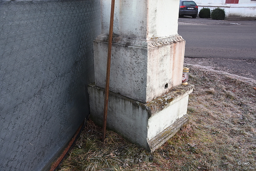 V trávě u silnice stojí na kamenné základně masivní stupňovitý sokl kříže obdélného půdorysu. Základna zapuštěná v zemi není natřená, dorovnává terén. Na horní straně oblá římsa. Na ní umístěn nízký masivní blok s hladkými stěnami a horní přesahující římsou. Střední část má na čelní straně nápisové pole zhruba obdélného tvaru s horními uchy, jimiž je „provlečena“ girlanda. Nápis je sice čitelný, ale nečitelný – použitý typ písma dává neznalému jen zhruba tušit, co je tu napsáno (k jednoznačnému rozluštění je jméno a datace). Nejvyšší stupeň soklu má na čelní straně oválné nápisové pole, lemované girlandovým věncem, jehož konce přesahují na boky soklu. Typ písma stejný jako níže, troufám si poznat jen úvodní JESUS. Ovál je „zavěšen“ stuhou s mašlí na skobě.