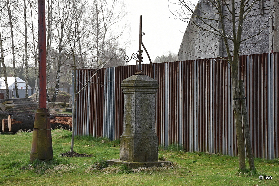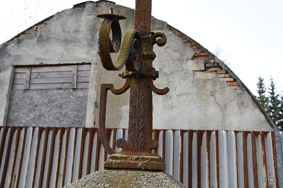 Před plotem z vlnitého plechu v trávě sokl s ulomeným zbytkem kříže.