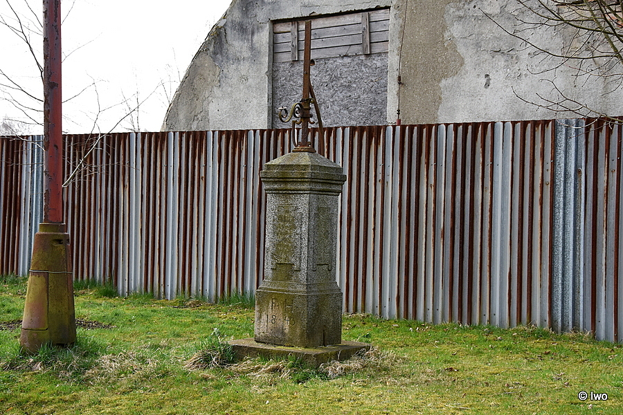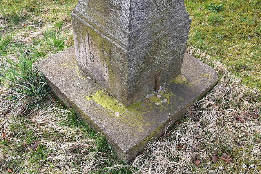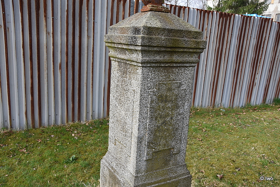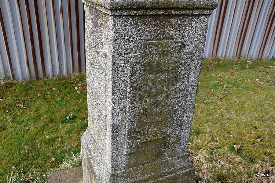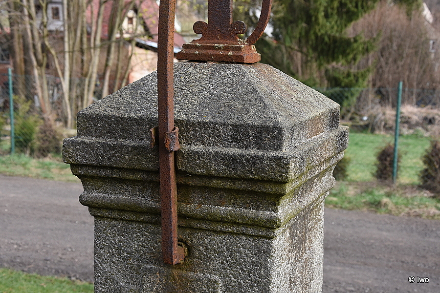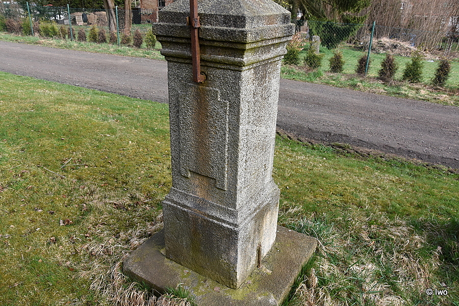 V trávě u silnice kamenná základna čtvercového půdorysu, na ní stupňovitý sokl, přichycený na bocích kovovými sponami. Širší nižší část s hladkými stěnami má na čelní straně iniciály FH a letopočet 1843. Na horní hranou projmutá lišta. Užší vysoký dřík má na stěnách obdélná pole ve spodní části s uchy, v horní s vybráním. Na čelní straně skvrny po zmizelém nápisu. Nad oběžnou útlou oblou lištou hlavice, ve spodní části projmutá, ve středu rovná římsa, nad mírným zúžením pak zkosený jehlan. Na jeho vrchu zbytek kovového kříže. Nad podstavcem lyra (pravá část ulomená), nad ní hák na lampu. Břevno zdobeno vroubkováním. Oblouková vzpěra, vedená sponou v hlavici, je ukotvena v zadní horní části soklu.