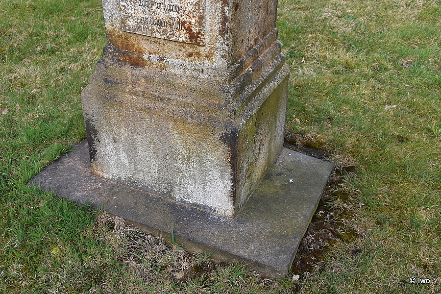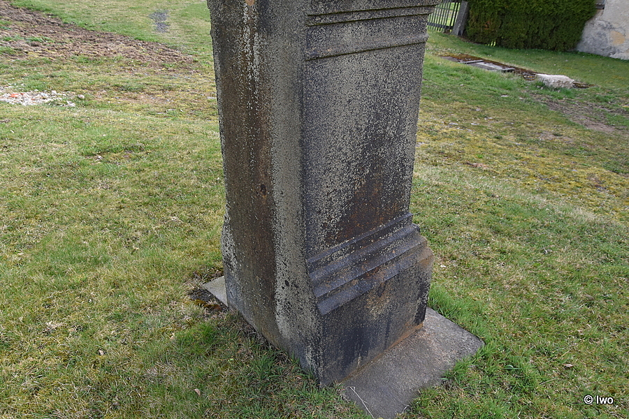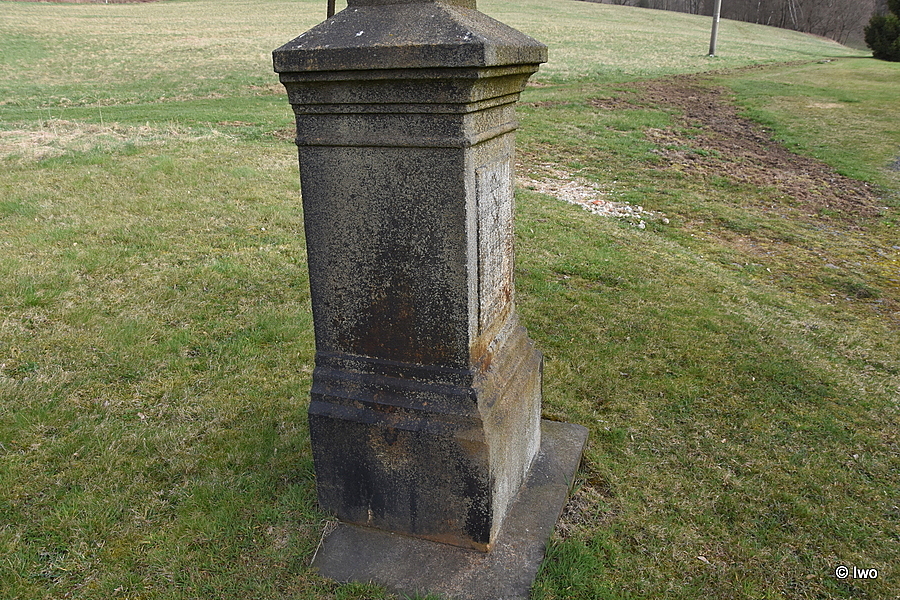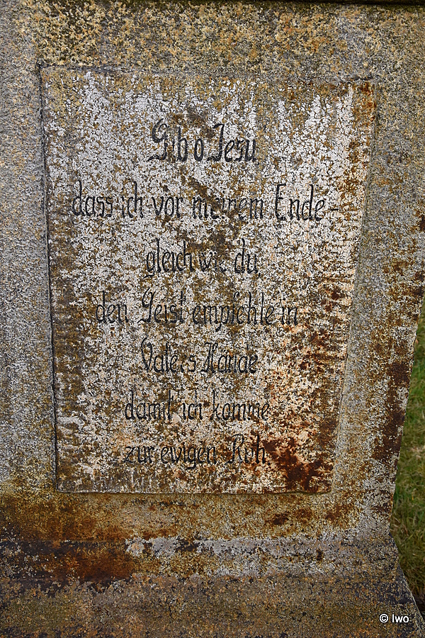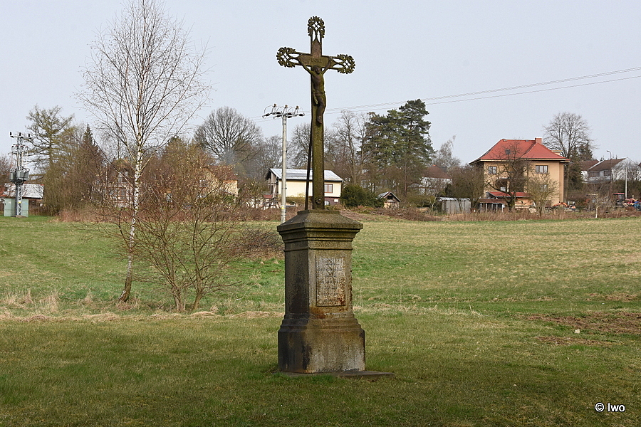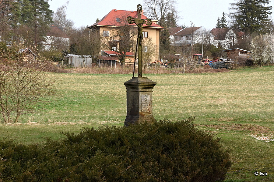 V trávě osazená kamenná základna, na níž stojí stupňovitý sokl s plochou zadní stranou. Spodní širší nízká část má hladké stěny, na horní hraně trojí stejně široké odstupnění a jedno užší. Následuje vlastní tělo soklu, na přední straně s vystouplým obdélným nápisovým polem a oběžnou oblou lištou v horní části. Nápis částečně čitelný (bez záruky): „G bo Jesu / dass ich vor meinem Ende / gleich wie du / den Geist empfehle in / Vaters Hände / damit ich komme / zur ewigen Ruh“. Odstupňovaná rozšiřující se hlavice, zakončená seříznutým jehlanem. Na vrchu vystouplá rovná plocha, v ní vsazen mohutný kovový kříž. Trámy mají zdůrazněné okraje, dole je připevněn reliéfní květ, konce břeven ozdobeny složitým gotizujícím dekorem. Za hlavou Ukřižovaného plastická písmena INRI. Postava Krista je poněkud netradičně k příčnému břevnu za ruce přivázána.