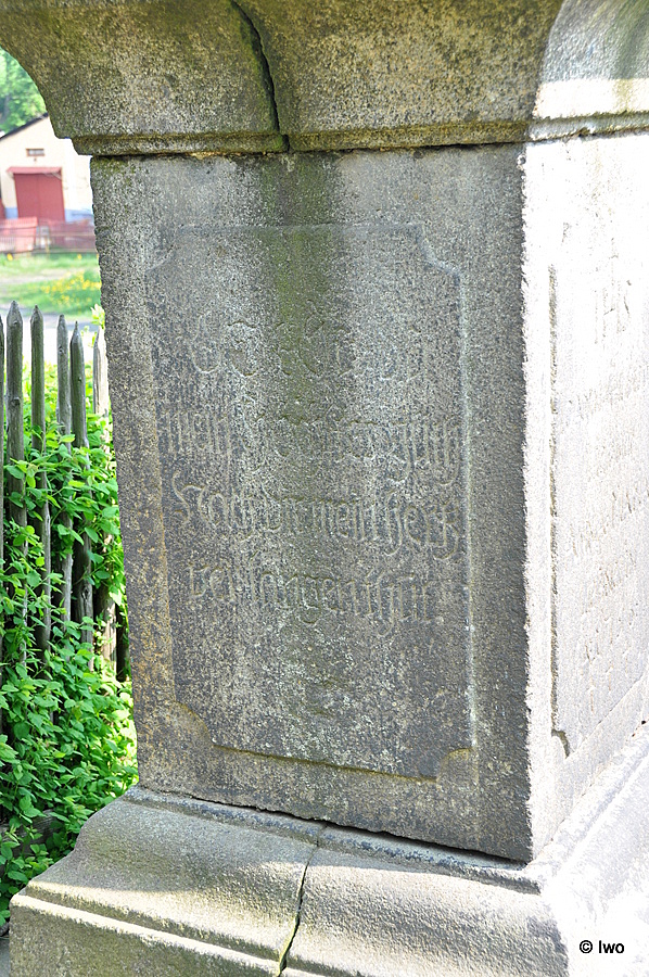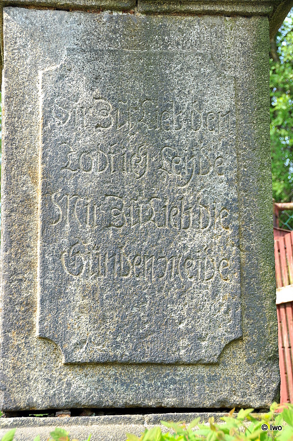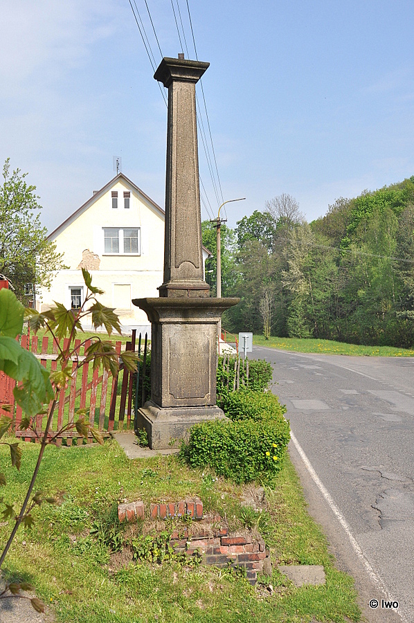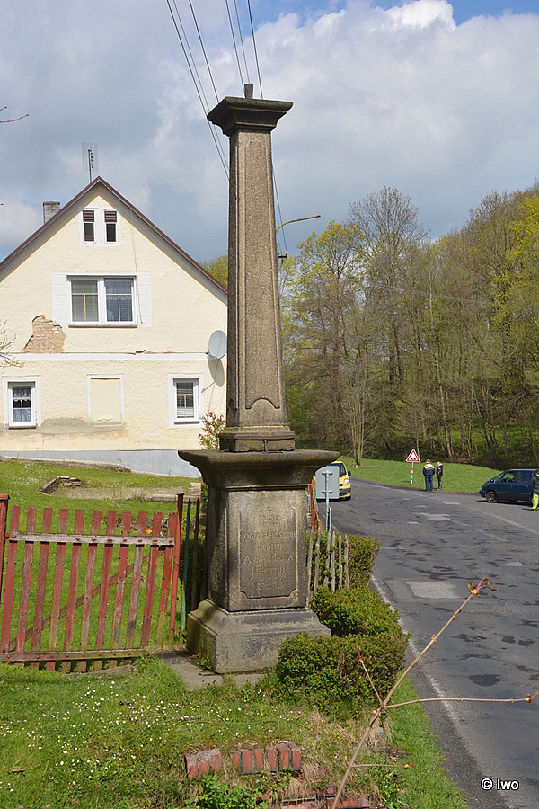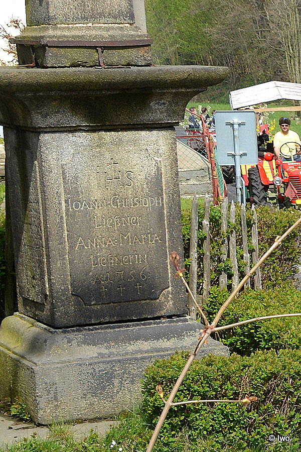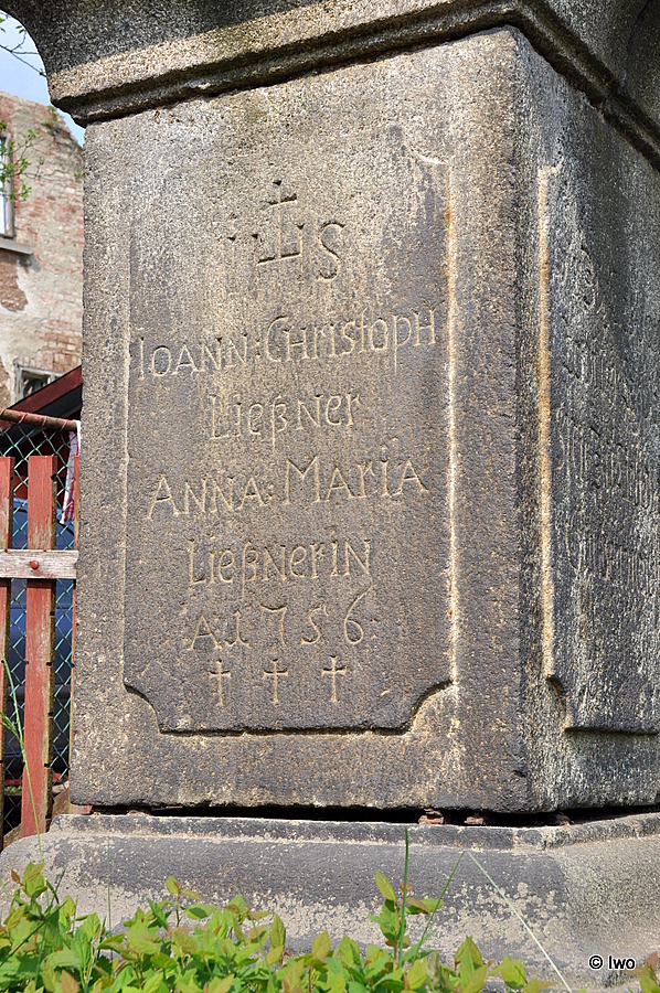Na vyvýšenině nad silnicí, částečně vyztužené cihlovou vyzdívkou, čtvercová kamenná základna s obvyklým stupňovitým soklem čtvercového půdorysu. Nižší širší stupeň s hladkými stěnami (prasklý) přechází projmutou lištou do vlastního těla, jež je od spodního dílu odděleno a vypodloženo (na fotografiích je patrné, že je mezi nimi škvíra, přes kterou je vidět skrz!). Vrchní díl má na stěnách mírně vystouplá obdélná nápisová pole s vykrojenými rohy. Na čelní straně IHS s křížem v písmenu H, dále pak IOANN CHrIStOPH / LießNer / ANNA MAriA / LießNeriN / A 1756 / † † †. Boční nápisy zachovalé, ale pro použitý typ písma pro mne nečitelné. Široce přesahující hlavice je prasklá. Na její rovné ploše není kotven kříž, jak je obvyklé, ale stojí na ní další vysoký štíhlý sokl, zužující se směrem vzhůru. Nízká čtvercová základna s lištou, kolem kovová objímka s ukotvením do hlavice pod ní. „Sloup“ cca dvojnásobné výše spodního soklu. Na jeho bocích vystouplé obdélné pole s obloukovým vybráním dole a vykrojenými rohy nahoře. V horní části hlavice stejného tvaru a členění jako vespod, samozřejmě v příslušném poměru zmenšená. V ní zbytek kovu – dle výše citovaného textu pozůstatek odstraněného kříže neznámého provedení.