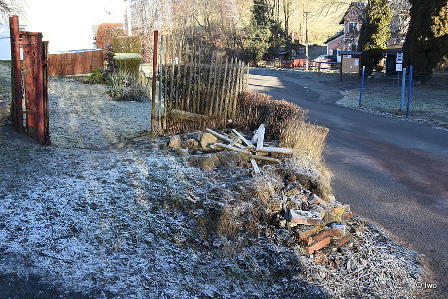 27. 12. 2025 – Kříž je fuč, místo je rozvrkočené a prázdné. Snad proto, že se kříž opravuje (doufám). Zídka je v dezolátním stavu – pokud se kříž vrátí, je třeba ji postavit znovu.