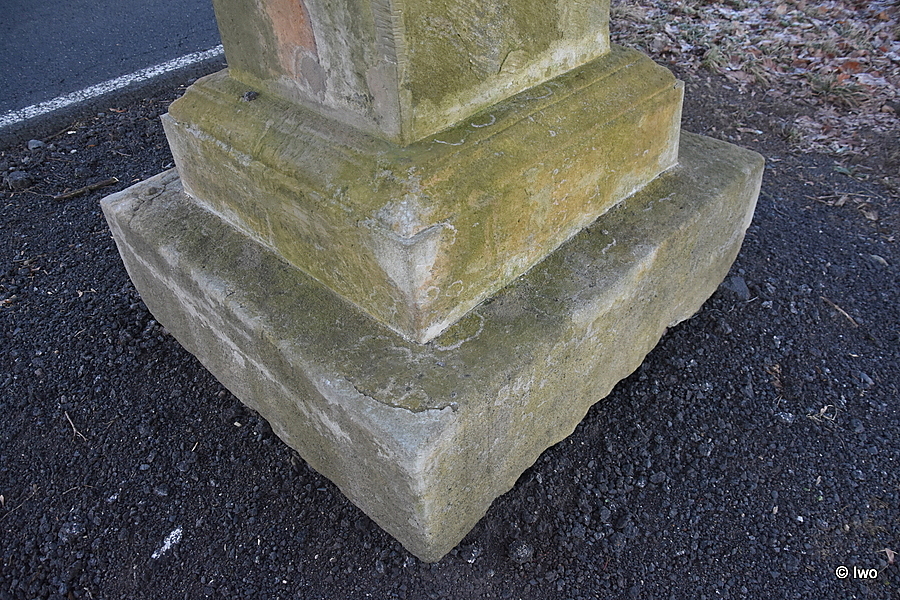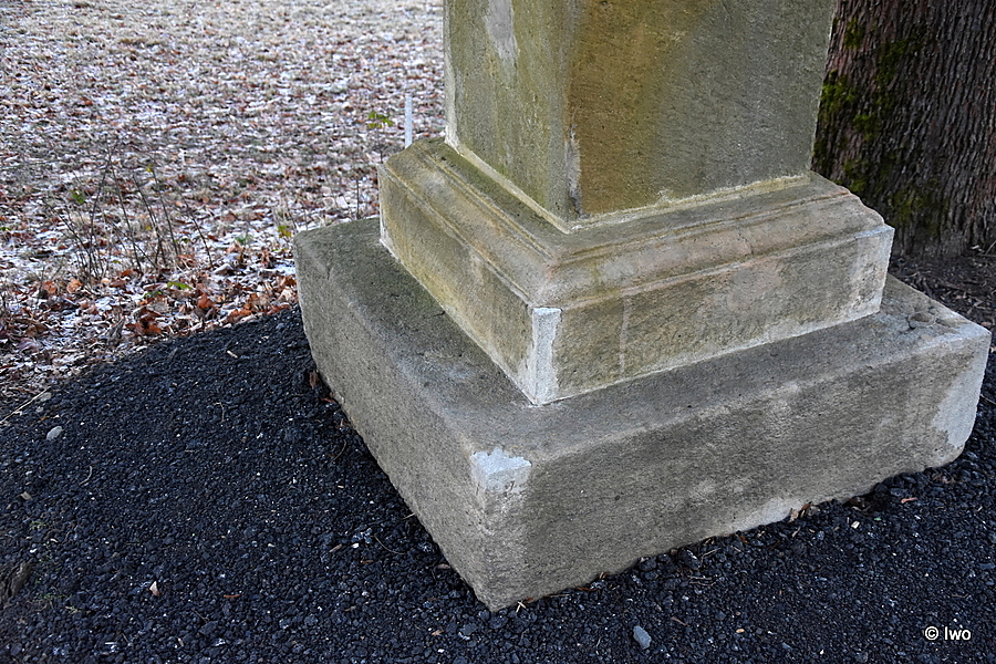 U silnice mírný kopeček ze hmoty, zpevněné asfaltem. Na něm čtvercová kamenná základna, na níž stojí stupňovitý sokl s hladkou zadní stranou. Všechny kamenné prvky jsou vyspraveny, dotmeleny, ovšem materiálem zcela jiné barevnosti i struktury. Sokl začíná vespod nízkým stupněm, na horní hraně s profilovanou lištou. Druhý vyšší stupeň s hladkými stěnami a projmutou lištou nahoře. Poslední část soklu se mírně zužuje směrem vzhůru, na stěnách má rytý obrys obdélného zrcadla – na bocích s vykrojenými rohy, na čelní straně v horní části oblouk kopíruje tvar vrcholové hlavice. V čelním poli oválný reliéf s písmeny IHS. Pod písmenem H trojice hřebů, kterými byl Kristus přibit na kříž, pod nimi srdce, kolem něho letopočet 1747. Vlevo a nad jsou v kameni otvory, vpravo znatelný není (možná byl zatmelen při opravách) – snad pozůstatky nějakého nosiče chybějící lampy. Hlavice je oblouková, s rovnými křídly, stupňovitá. V horní části siluetový kříž, stále ještě svítící novotou. Ploché pásy kříže se spodní lištou pro postavy Panny Marie a svatého Jana Evangelisty jsou doplněny rostlinným dekorem a plastickými zlacenými kvítky. Příčné břevno na koncích s trojlístkem a zlacenou dekorativní ozdobou. Nad hlavou Krista praporek INRI.