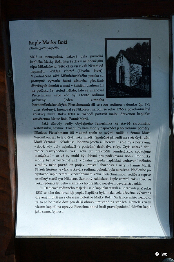 V inventárním soupisu kaplí z roku 1837 se píše: Je postavena celá ze dřeva, velmi malá a nenápadná, leží na nejhornějším konci vesnice. Byla postavená v roce 1803 bývalým kolářským mistrem jménem Nikolaus Pietschmann a až do dneška je udržována jeho dětmi. Nemá vlastní kapitál, má oltářík ze dřeva s obrazem Bolestné Matky Boží. Je přezdobená malými nehodnotnými obrázky, jako všechny polní kaple….
