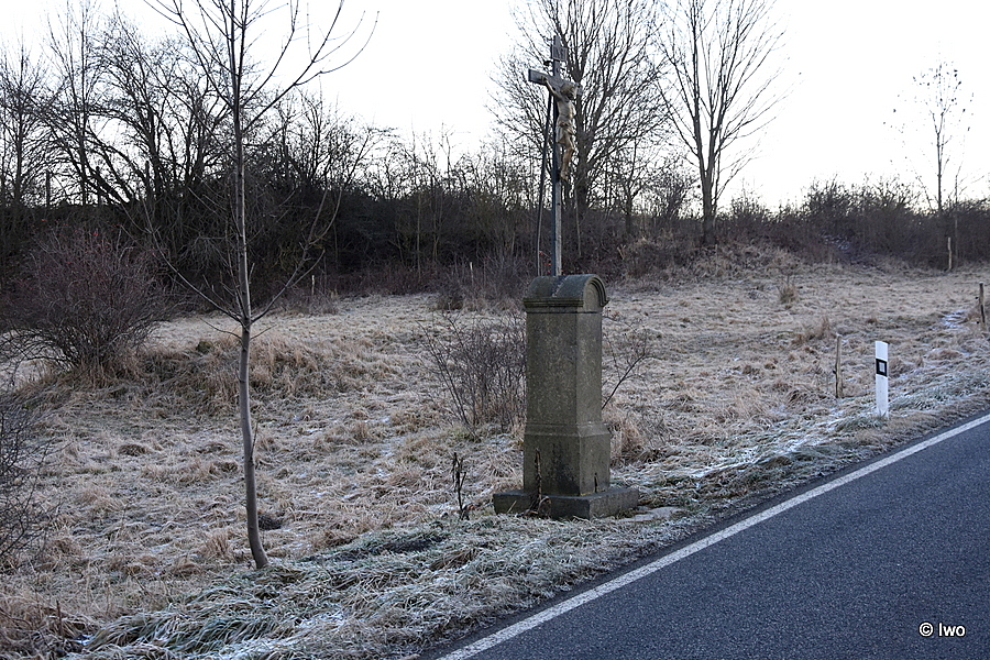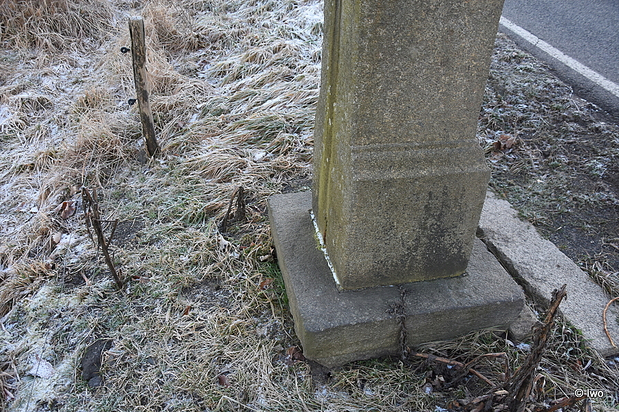Mezi silnicí a křížkem v terénu zapuštěný kamenný blok, snad klekátko. Vyšší čtvercová kamenná základna, do ní kovovými sponami upevněný stupňovitý sokl s rovnou zadní stranou. Spodní hranol s hladkými stěnami přechází vyšší profilovanou lištou do vysokého kvádrového dříku bez ozdob či patrného nápisu. Na vrchu samostatný díl – oblouková hlavice s krátkými rovnými křídly. Zda v původní podobě a velikosti, je otázka – čelní stranu zdobí vpadlé kruhové pole, jemuž chybí spodní část, jako kdyby byla hlavice zkrácena/snížena. V horním oblouku vsazen plochý kříž, mající na přední straně dekor imitující dřevo. Podepřen vzpěrou, kotvenou do zadní strany soklu. Nad hlavou Krista tabulka INRI.