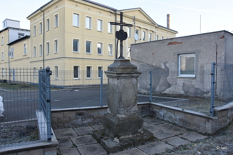 Ve vybrání, vytvořeném v oplocení továrního areálu bývalé Klingerovy továrny, stojí kříž manželů Endlerových.