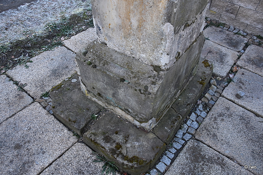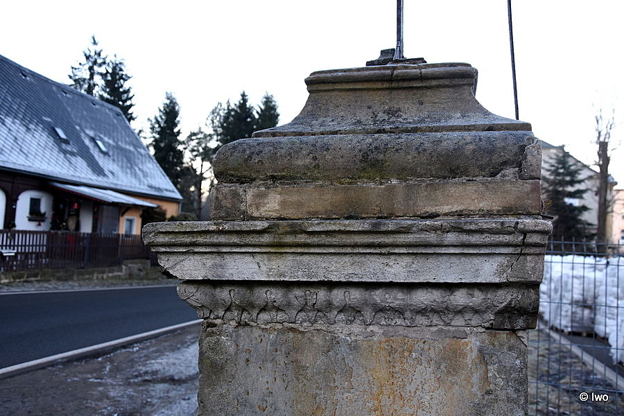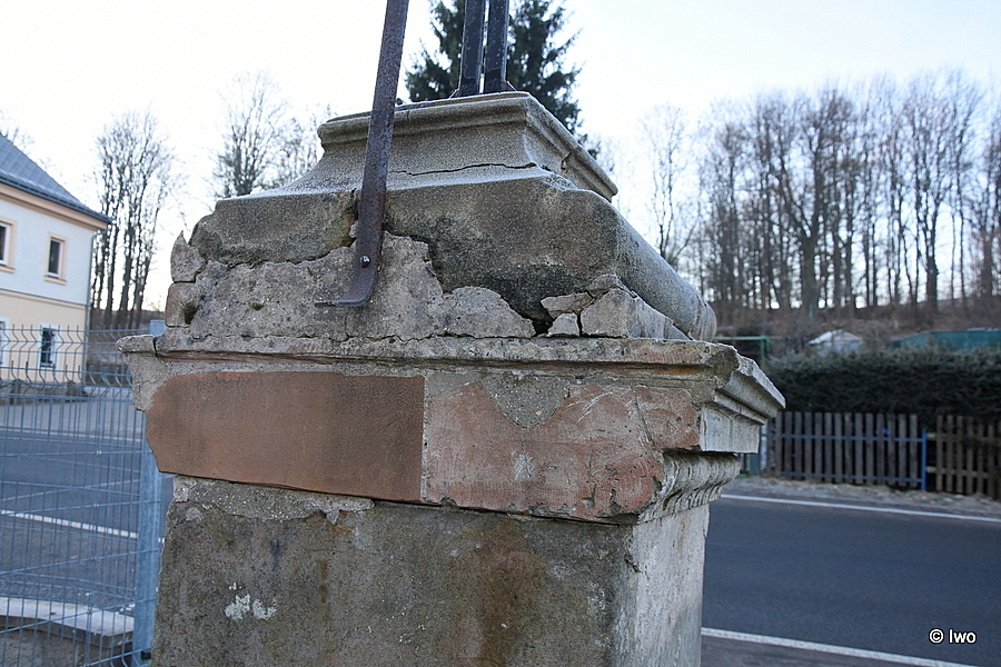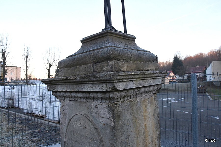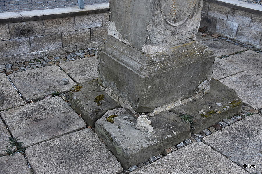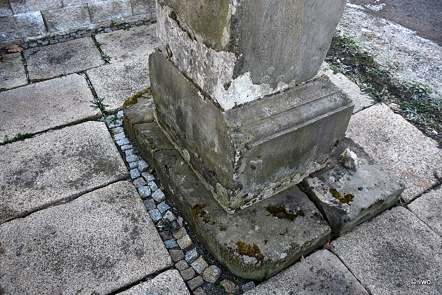 Mezi dlaždicemi, kterými je vyloženo prostranství ve vybrání plotu, čtvercová vyvýšená základna z několika kamenů, nesoucí stupňovitý sokl s hladkou zadní stranou. Kámen je silně poškozený, na mnoha místech se drolí, místy mech. Viditelné jsou nějaké opravy, ale tmel jiné barevnosti odpadává.