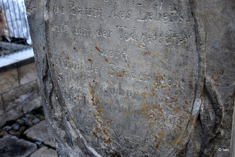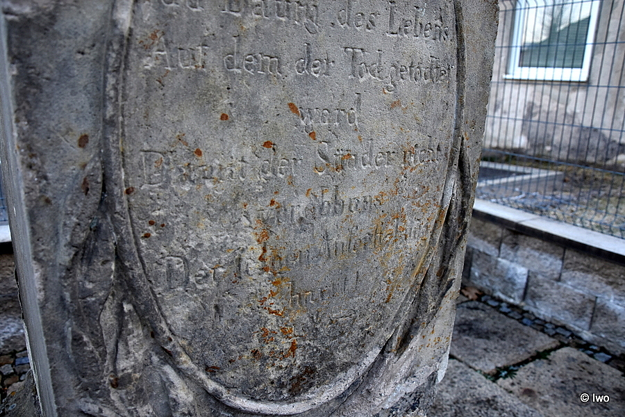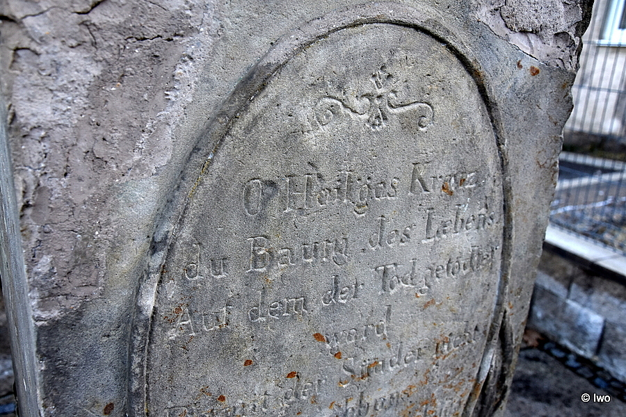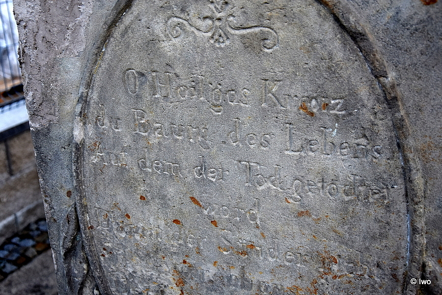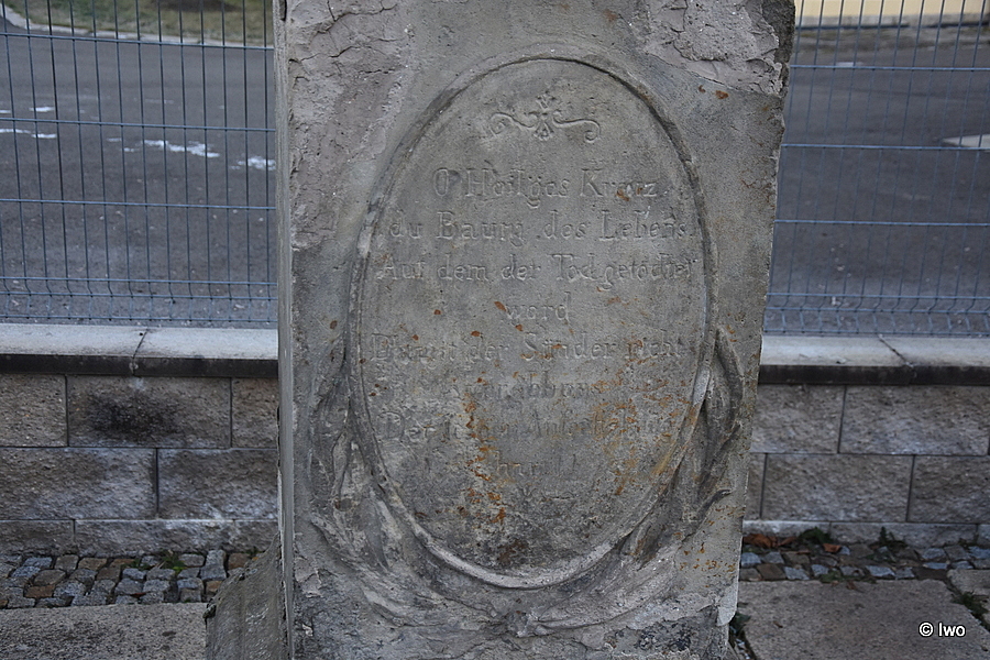 Spodní nižší hranol s hladkými stěnami má na horní hraně nejprve oblou lištu, na ni navazuje užší lišta projmutá. Vyšší užší kvádr má na čelní straně oválné nápisové pole, zdobené ve spodní části vavřínovými ratolestmi. V rámovaném oválu částečně nečitelný nápis (bez záruky, především ve spodní části nelze písmena rozeznat): O Heilgas Kreuz / du Baum des Lebens / Aus dem der Tod getoder / word / ?? der Süader richt / ?? / Der ?? Aufertt?? / ??