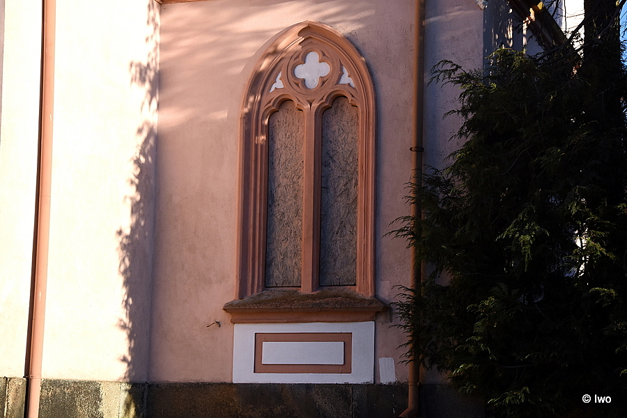 Kostel spolu s domem správce jsou vybudovány v novogotickém slohu. Stojí na půdorysu širokého písmene „L“ a jsou, až na věž, téměř totožné, jen zrcadlově obrácené. Stavba má ze hřbitovní strany dva vchody zakončené lomeným obloukem. Dveře jsou dřevěné, prosklené, a nahradily své kovové předchůdce, osazené při rekonstrukci provedené během normalizace. Okna, sdružená po dvou, zakončuje v přízemí vždy trojlaločný oblouk, v patře pak oblouk lomený. Namísto kovových oken z osmdesátých let 20. století jsou od léta 2016 osazené repliky původních dřevěných oken. Fasáda kombinuje bílou a žlutou barvu, v letech 2004–2016 ovšem byla růžová. Středový rizalit a fasádu zdobí štukové šambrány, reliéfy (čtyřlisty a čtyřlaloky), obloučkové vlysy, římsy a nárožní fiály obdélníkového průřezu. Sedlovou střechu kryje břidlice. Ze středu kostelní lodi vybíhá mohutný osmiboký sanktusník.