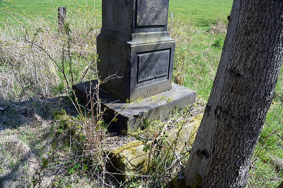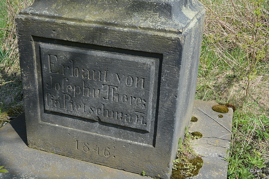 Dnes je kříž u cesty spíš smutnou připomínkou sama sebe. Takřka přímo před ním roste strom, dle tloušťky kmene ne zrovna krátce… Základna je zarostlá v terénu, mech, tráva, klacky. Na ní další stupeň z barevně odlišného kamene, čtvercový blok tvoří podstavec soklu. Ten má klasický stupňovitý tvar s rovnou zadní stranou. Spodní širší hranol má na čelní straně obdélné nápisové pole: Erbaut von / JosephuThere: / siaPietschman. Pod nápisem na spodní straně letopočet 1846. Hranol přechází projmutou lištou do vlastního užšího těla. Na přední straně vystouplé obdélná pole, na němž je patrné, že neslo nápis. Nad ním reliéfní květ pod obloukovou hlavicí s krátkými rovnými částmi po stranách, zdobenými střapci. Na vrchu prasklé hlavice trn pro chybějící lampu. Kříž nesl siluety Kalvárie, z nichž zbylo pramálo – v podstatě jen holá orezlá konstrukce, kterou drží tyčová vzpěra, kotvená do zadní strany soklu. Na vrcholu kříže Bůh Otec se vztyčenou žehnající pravicí (obdobný několika dalším místním křížům).