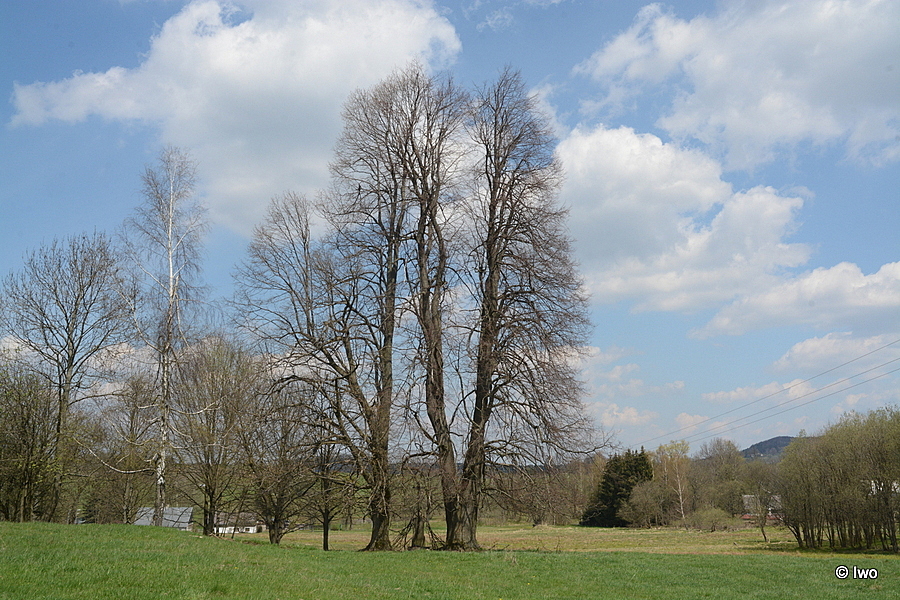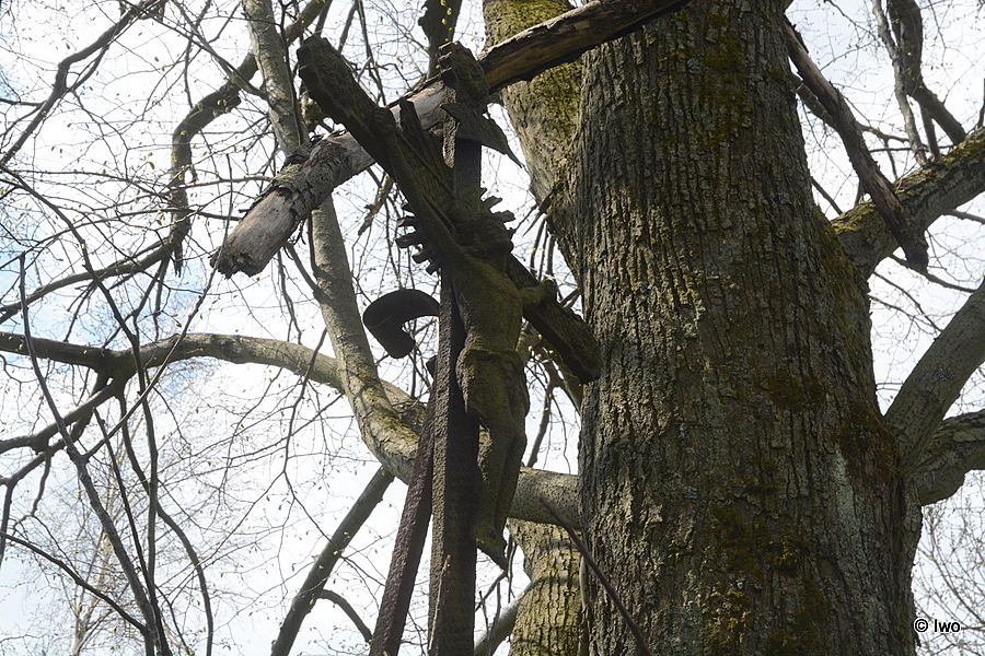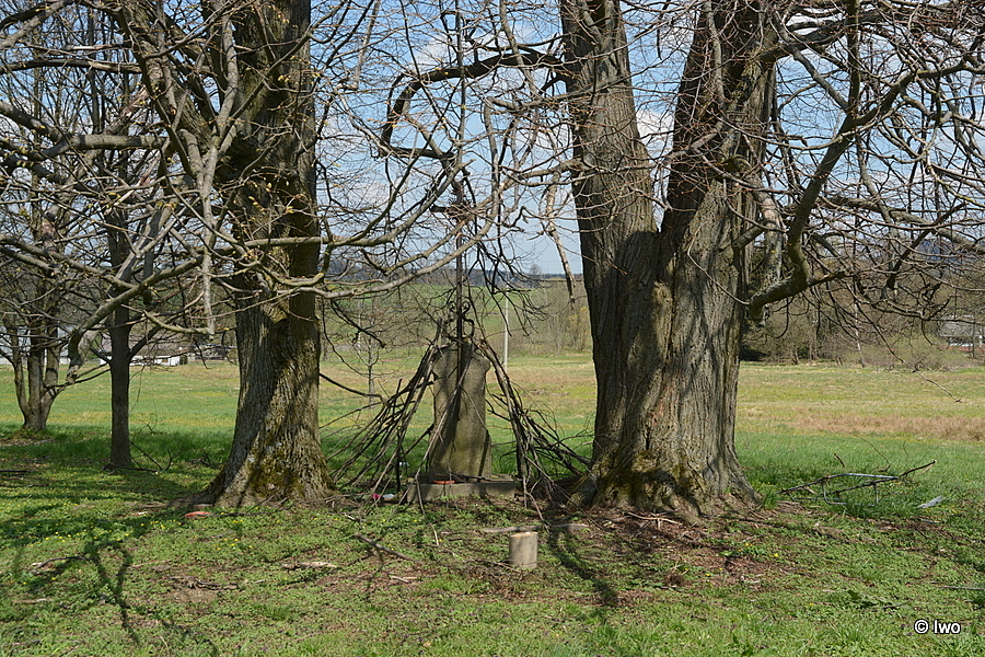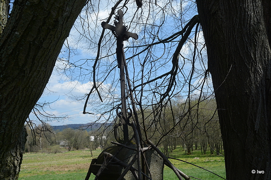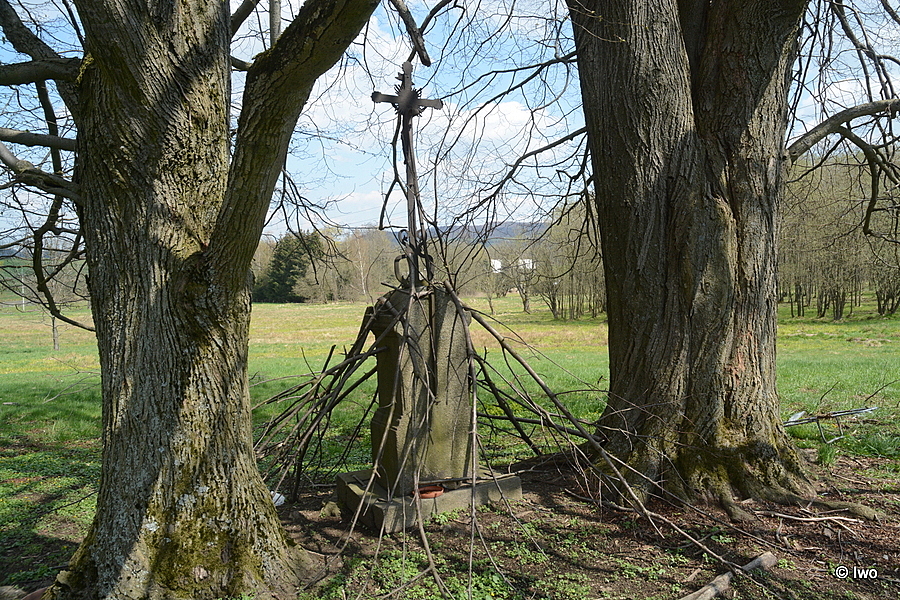 Uprostřed „ničeho“ mezi stromy na lukách mimo cesty k železniční zastávce Mikulášovice horní nádraží stojí kříž.