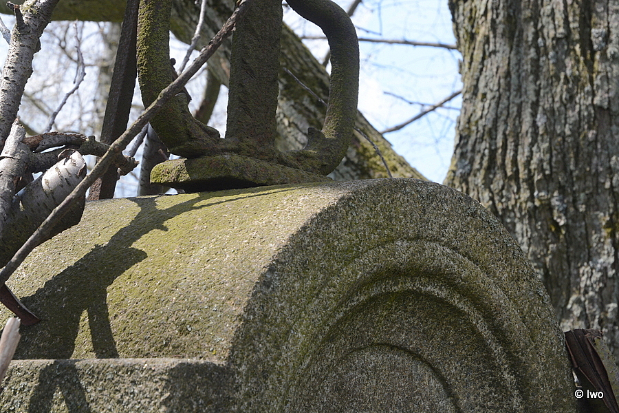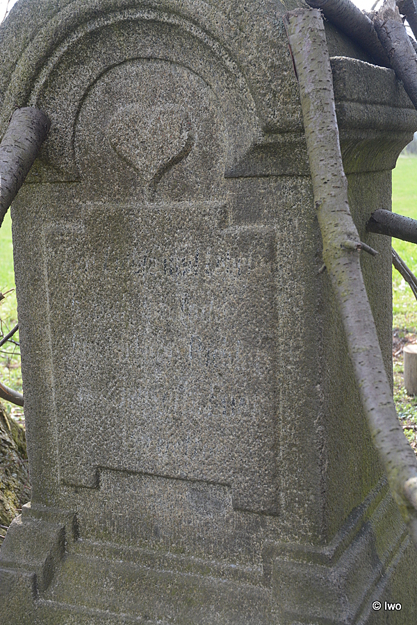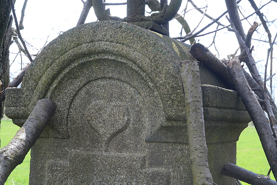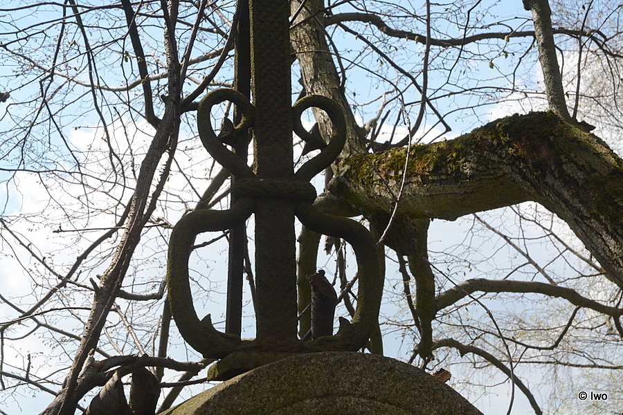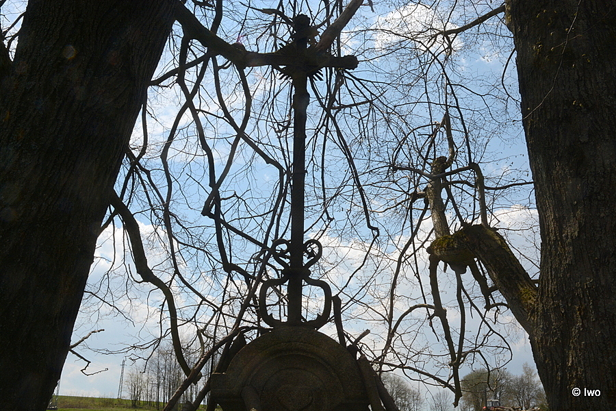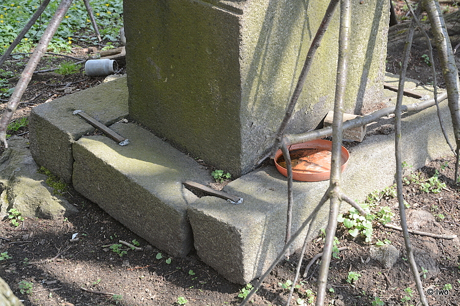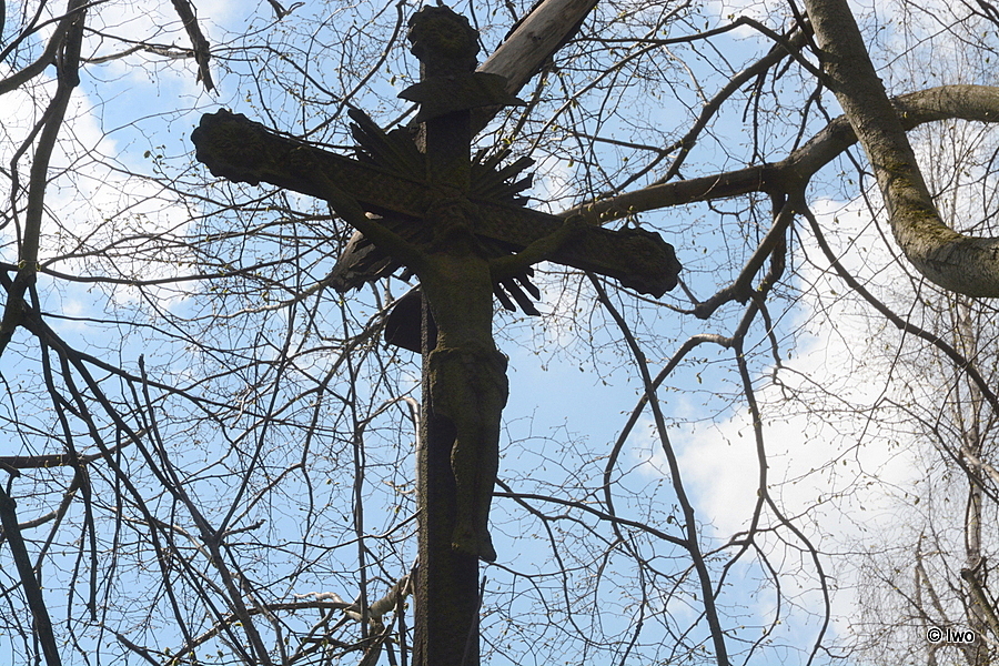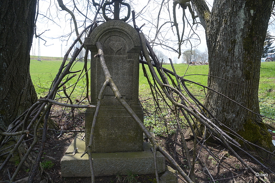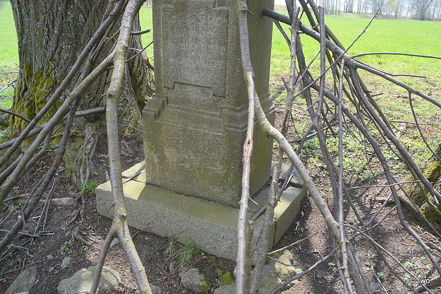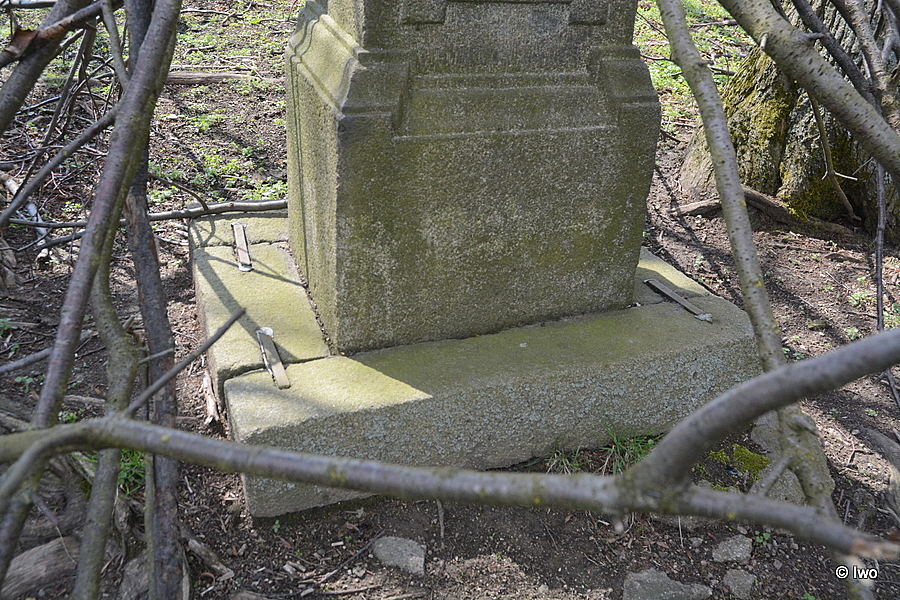 Mezi vzrostlými stromy obdélná kamenná základna z blok pospojovaných kramlemi. Mezi kvádry umístěn sokl obvyklého stupňovitého tvaru s hladkou zadní stranou a obdélným půdorysem. Spodní širší část s hladkými stěnami přechází na rozích tvarovanou profilovanou lištou do vlastního těla soklu. To má na čelní straně vystouplé obdélné pole se spodními uchy a horními vykrojenými rohy, patrné jsou zbytky rytého (ale nečitelného) nápisu. V oblouku hlavice s krátkými rovnými křídly nad nápisovým polem reliéf srdce. V oblouku osazen kovový zdobný kříž, ve spodní části šípovitá lyra, povrch kříže plastický (zadní strana hladká). V místě křížení břeven nad hlavou Krista paprsčitá svatozář, konce břeven rozšířeny a ozdobeny reliéfním květem. Na hlavou Krista praporek (bez písmen). Kříž podepřen tyčovou vzpěrou, kotvenou do zadní strany soklu.