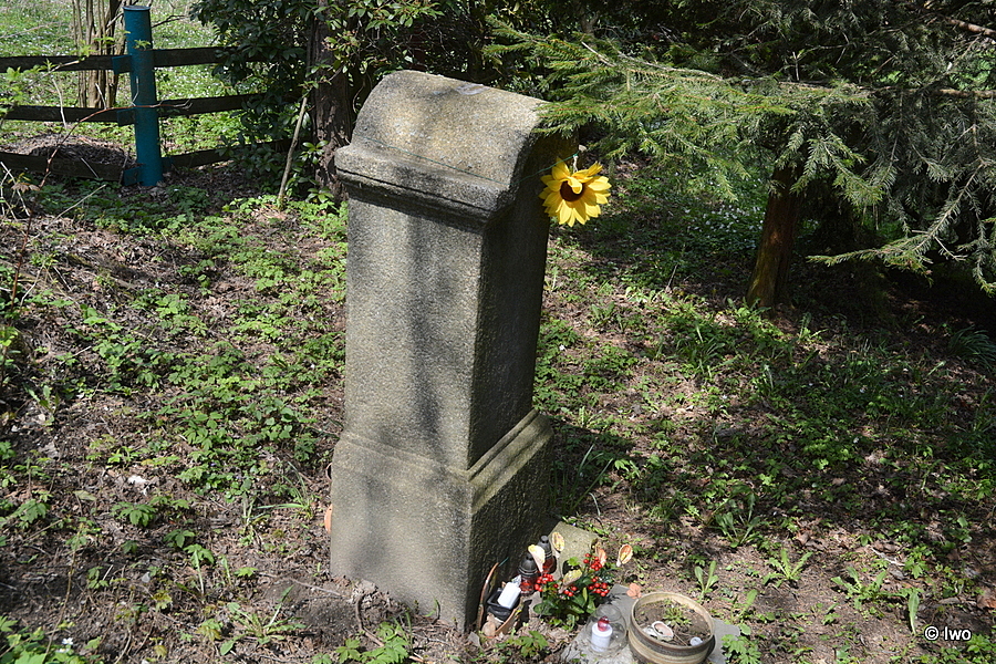 V terénu zahrady je patrný pouze zlomek kamenného bloku, především před soklem – zbytek je zřejmě pod nánosem zeminy. Sokl jednoduchý, klasický stupňovitý, s hladkou zadní stranou, v níž je otvor po vzpěře chybějícího kříže. Spodní širší hranol má na čelní straně obtížně rozeznatelné výše zmíněné iniciály a letopočet. Profilovanou lištou přechází do užšího vlastního těla, a přední straně nejspíš býval nápis. Oblouková hlavice s krátkými rovnými křídly má na vrchu zatmelený otvor po kříži.