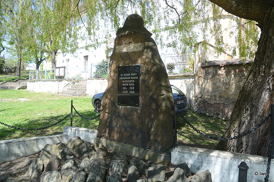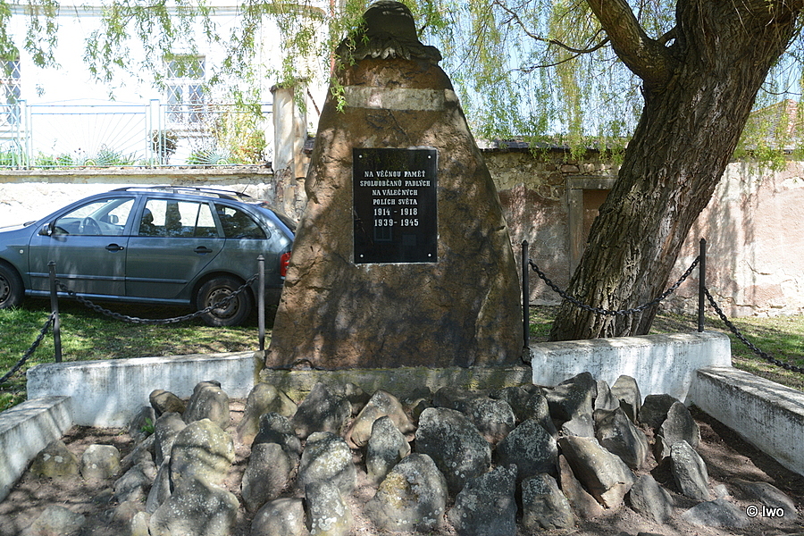Pomník občanům padlým ve válkách. Deska z černého skla na přírodním kameni ve tvaru trojúhelníku, postaveném na vyvýšeném podkladu. Kolem pomníku nízký plůtek tvořený sloupky se řetězy. Nápis: „Na věčnou paměť spoluobčanů padlých na válečných polích světa“.