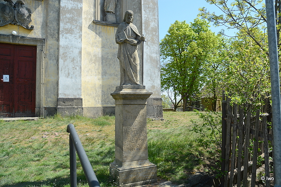 Na vrchu přístupového schodiště ke kostelu svatých Petra a Pavla v Jeníkově stojí vpravo socha svatého Pavla.