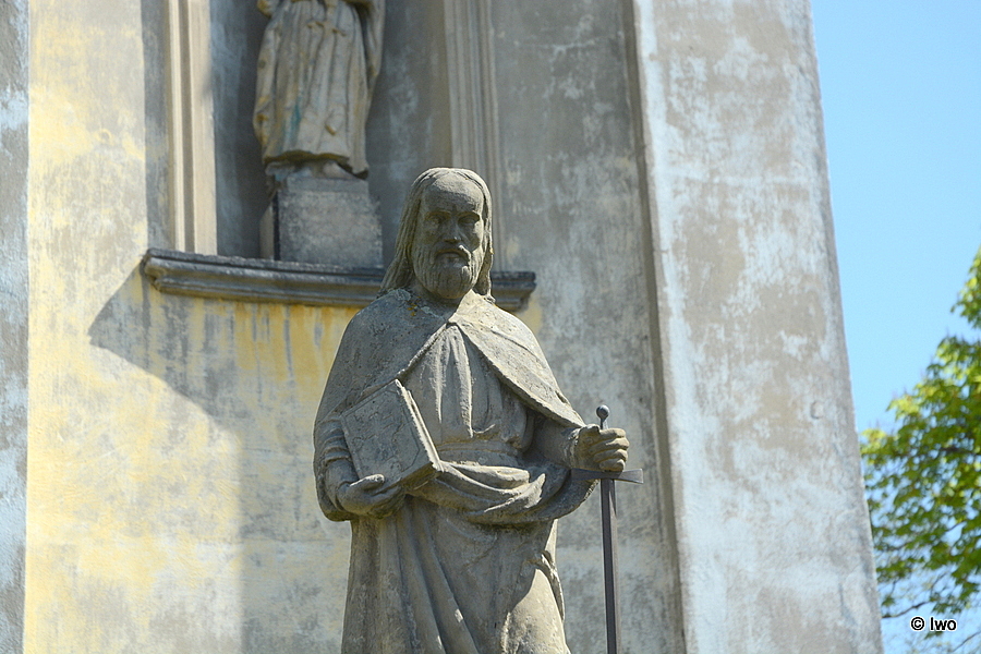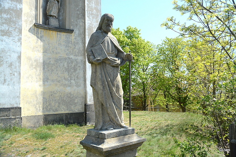 Na vrchu přístupového schodiště ke kostelu svatých Petra a Pavla v Jeníkově stojí vpravo socha svatého Pavla.