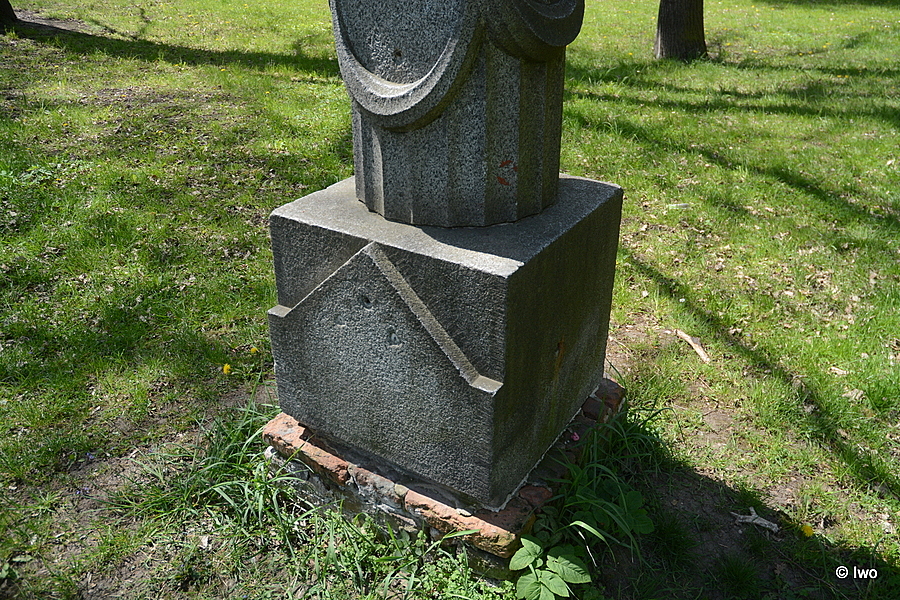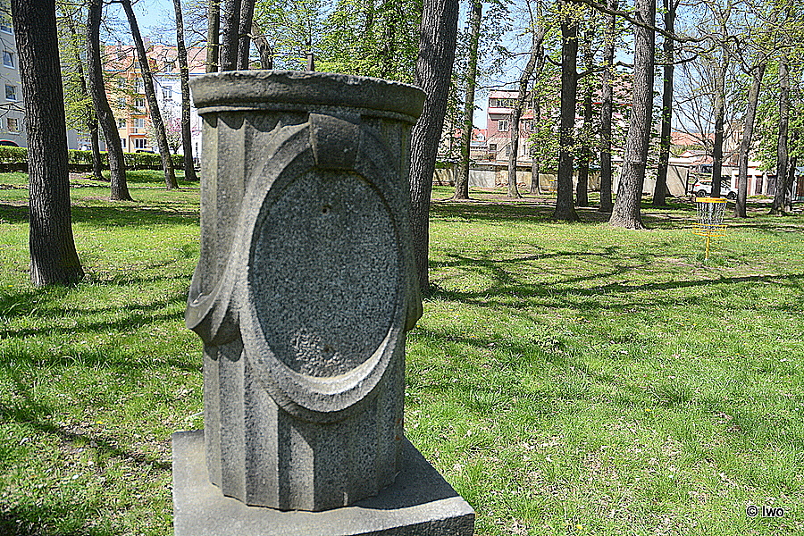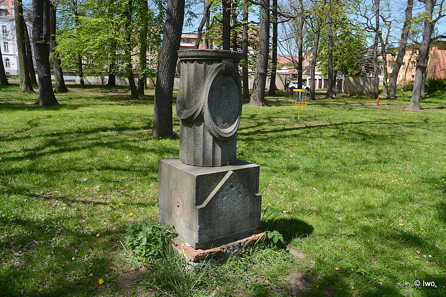 Na základně postavené velmi nahrubo z oprýskaných cihel, spojených jakž takž maltou (zřejmě na vybetonované placce) stojí spodní část. Kamenný kvádr s hladkými stěnami má na čelní straně vystouplý trojúhelný štít s krátkými rovnými křídly. V jeho ploše jsou vyvrtány tři otvory. Na levém i pravém boku kovový čep, zdůrazněný červeným kruhem (prochází skrz?). Na hranolu stojí samostatná část – část sloupu či sloupovitého podstavce. Vertikálně zdoben rýhováním. Na čelní straně oválná kartuše s rámem s „klenákem“, od něhož se po obvodu sloupu pnou prověšené závěsy ke dvěma patkám vzadu v horní části. Vrch sloupu tvoří „talíř“ , v jehož středu ční kovový čep.