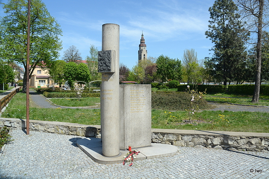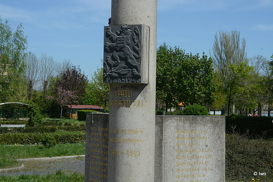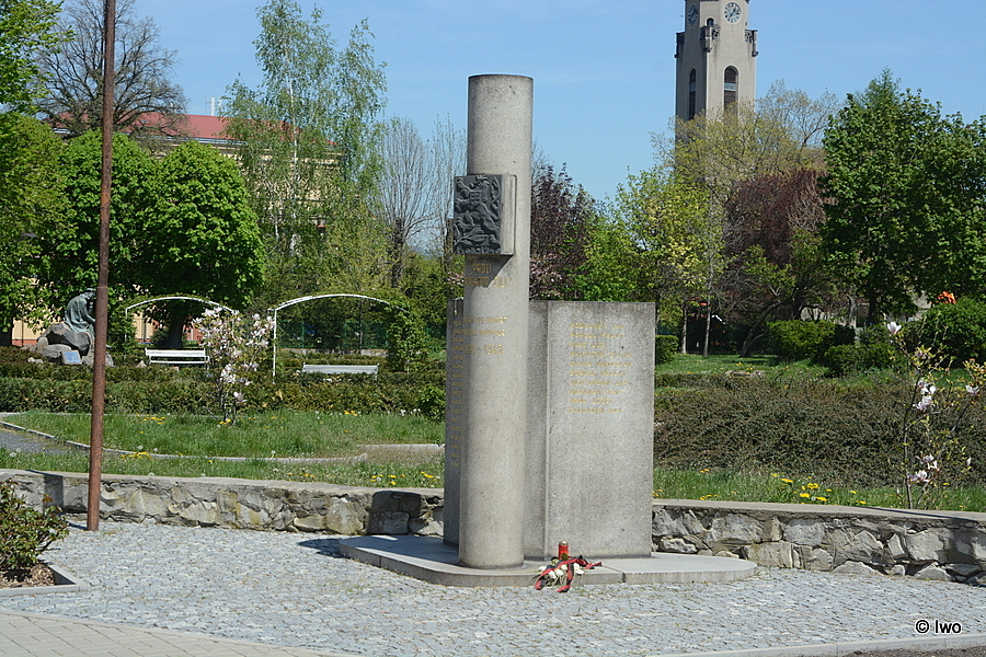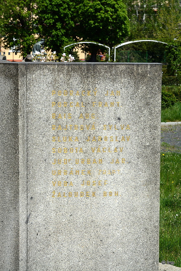Pomník obětem II. odboje. Okrouhlý dřík na nízkém stupni, osazený reliéfní deskou s původním malým čsl. znakem s letopočtem. Do dříku jsou vsazeny po obou stranách žulové desky se jmény obětí. Pomník stál na nám. Legií (odhalen 8.5.1948), v r. 1974 byl přesunut.