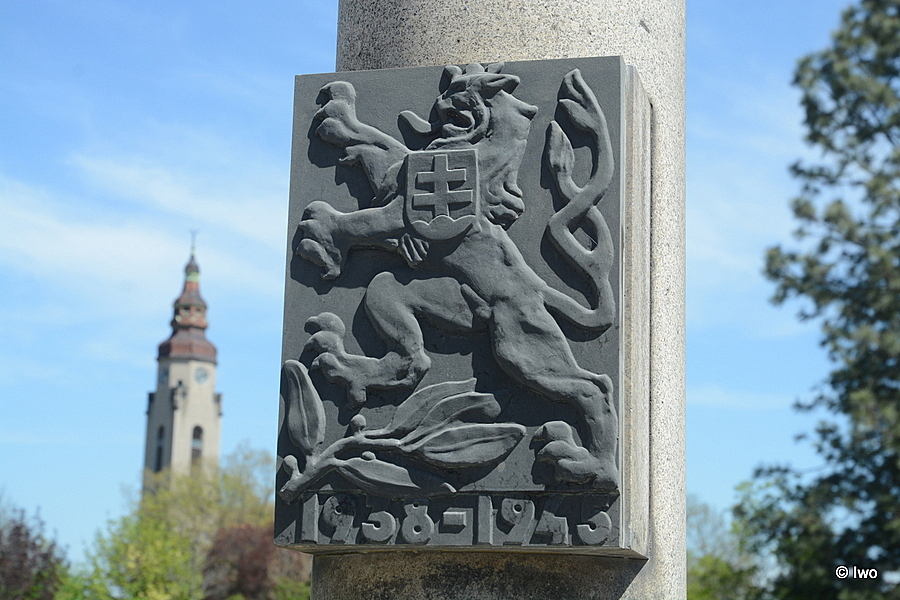 Na čsl. znaku letopočet „1938 – 1945“ a text „Padli abychom žili“ a „Na věčnou paměť obětem okupace 1938 – 1945“.