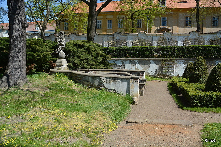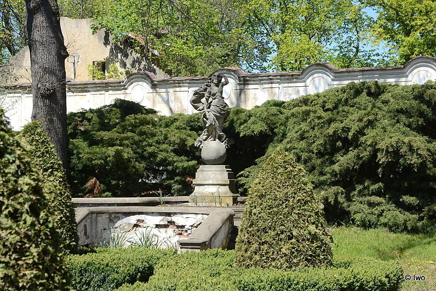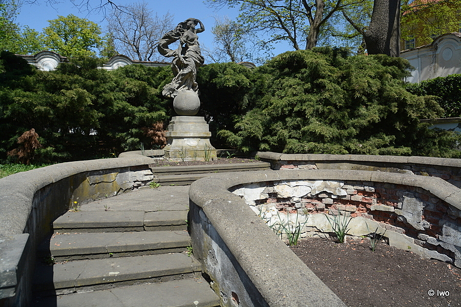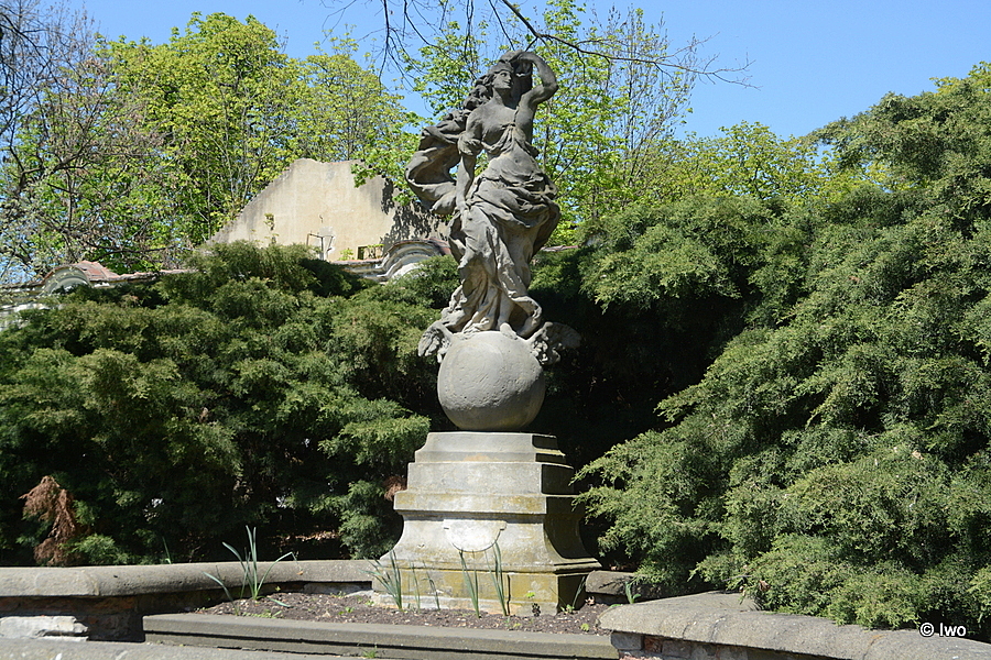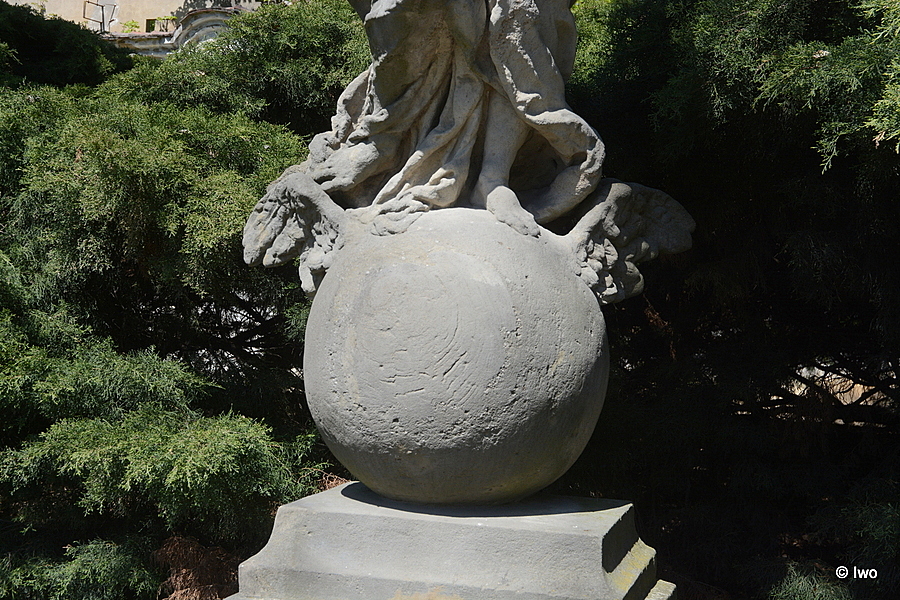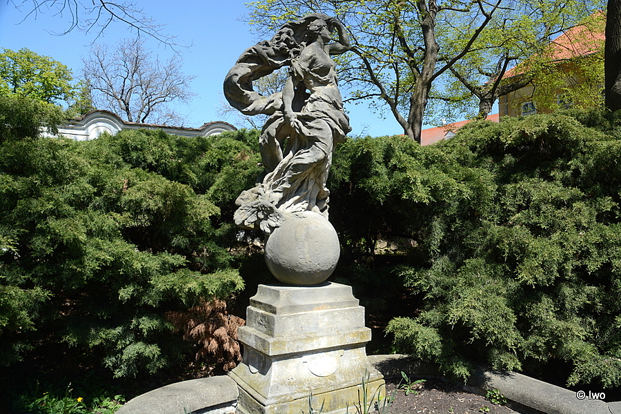 V tzv. Knížecí zahradě (za východním křídlem zámku). Na vyvrcholení dekorativního schodiště podkovovitého tvaru nízký profilovaný podstavec. Na něm ženská postava s vlajícím rouchem, stojící na zeměkouli. Pískovec. Neznámý sochař po roce 1720. 1967 – poškozena, chybí ruka.