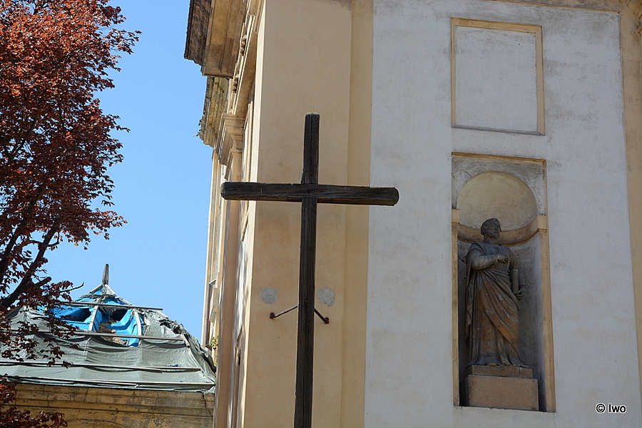 V ulici G. Casanovy před rohem kostela nad ohradní zídkou chodníku základna nepravidelného tvaru. Na ní vyšší kvádr čtvercového půdorysu, v němž je zasazen vysoký jednoduchý dřevěný kříž, přichycený v horní části pomocí dvou vzpěr do fasády (rohového pilastru). Dle způsobu provedení se nejspíš jedná o kříž misijní.