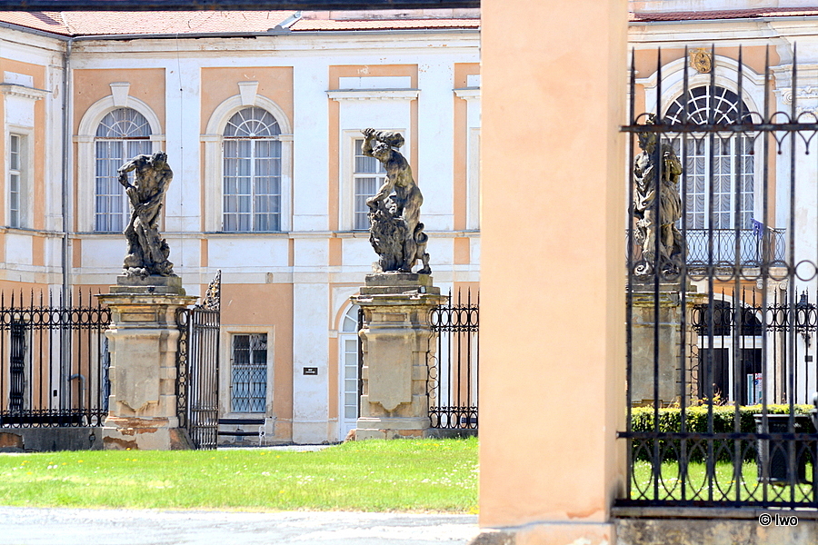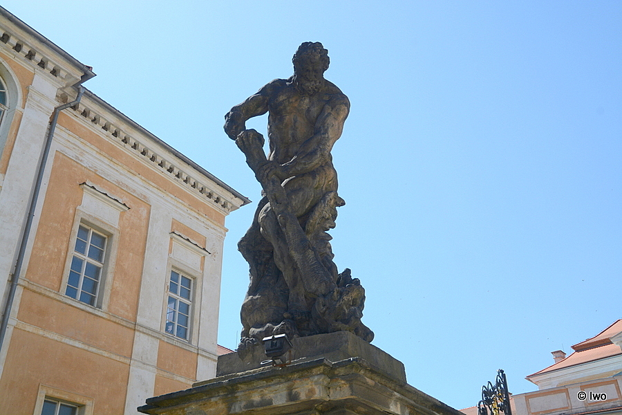 Nadživotní pískovcová plastika znázorňující mytologický motiv. Socha umístěna na jednom ze čtyř volných zděných pilířů stojících mezi pavilony na čestném dvoře. Socha pochází od sochaře Matyáše B. Brauna z 30. let 18. st. Svalnatý nahý muž zdolává saň.